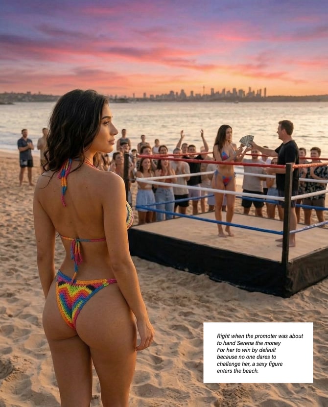 Serena, a confident and attractive brunette, strolls along the beach when she stumbles upon a makeshift fighting ring. Intrigued but dismissive, she initially pays it little mind until a promoter approaches her. Flattered by the attention and assured of her own beauty and physical prowess, Serena agrees to participate, expecting an easy victory against less attractive opponents. Her arrogance blinds her to the possibility of a real challenge, setting the stage for an unexpected confrontation.