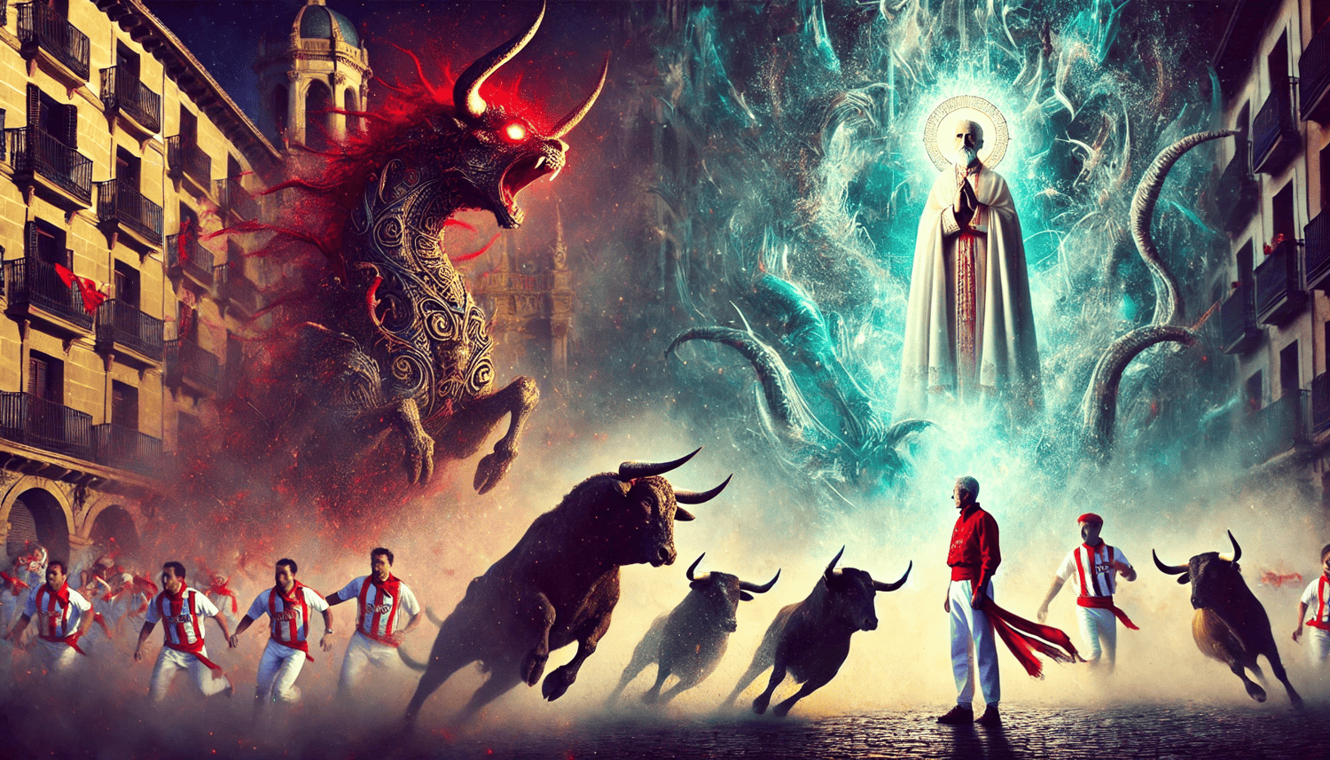 This stunning digital artwork captures the dual essence of Pamplona—a city renowned for its exhilarating Running of the Bulls and its deep spiritual connection to the Camino de Santiago (Way of Saint James). With dynamic movement, bold contrasts, and striking details, this piece immerses you in the tension between the wild energy of the streets and the sacred serenity of the Cathedral of Santa María la Real.
