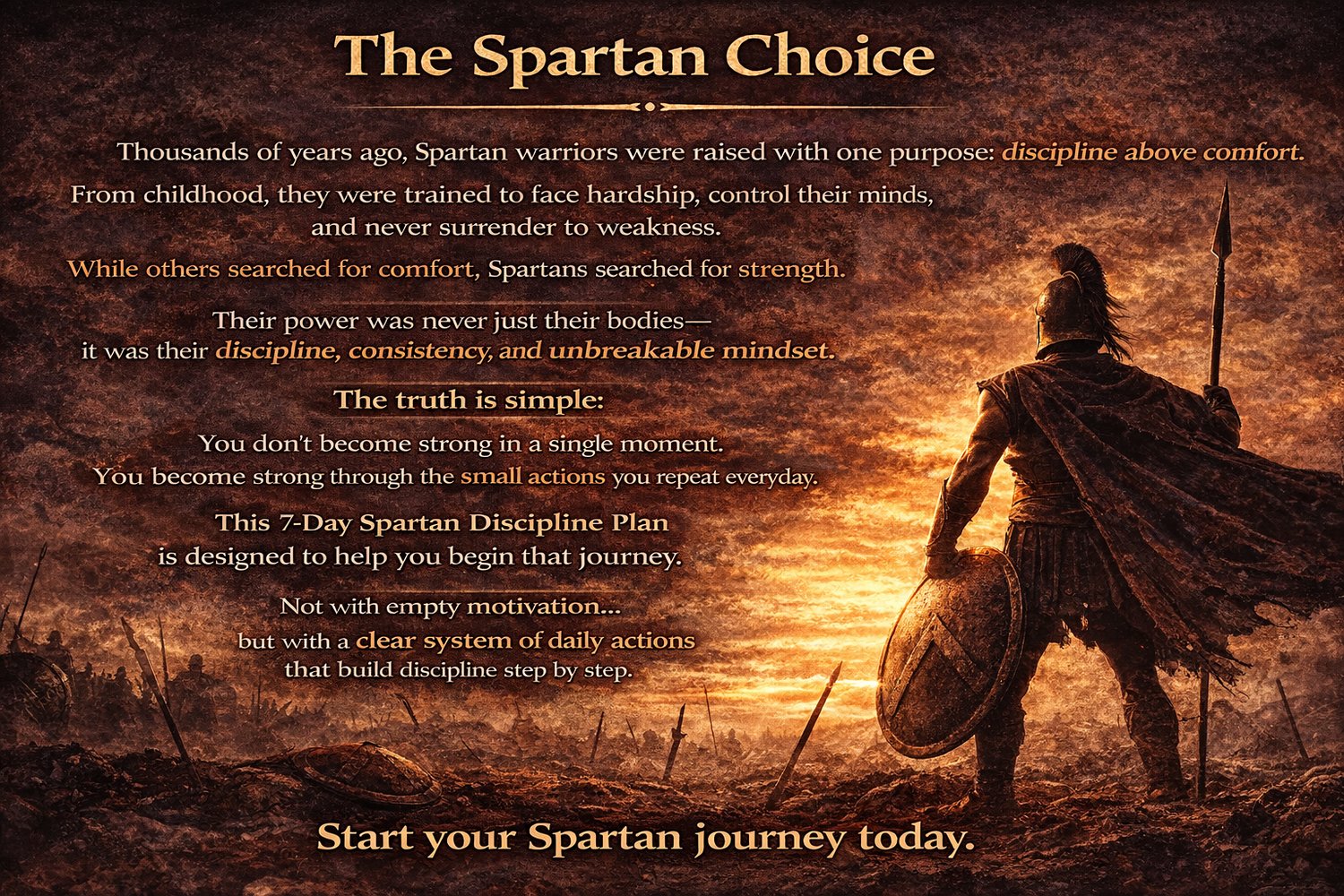 Transform your discipline, mindset, and daily habits in just 7 days using powerful principles inspired by the Spartan way of life.