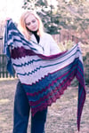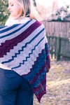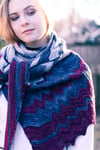 A line of textured chevrons sweeps diagonally across this asymmetric shawl, while contrasting color stripes expand and contract, accentuating the shifting ripples. Enjoy the relaxing garter stitch and the fun of stripes which form the basis of this wrap, while staying engaged by creating the expanding columns of chevrons that shift along the edge.