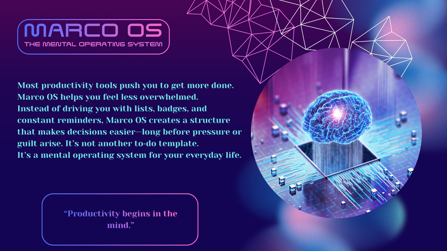 Marco OS is a mental operating system designed for people with high cognitive load.