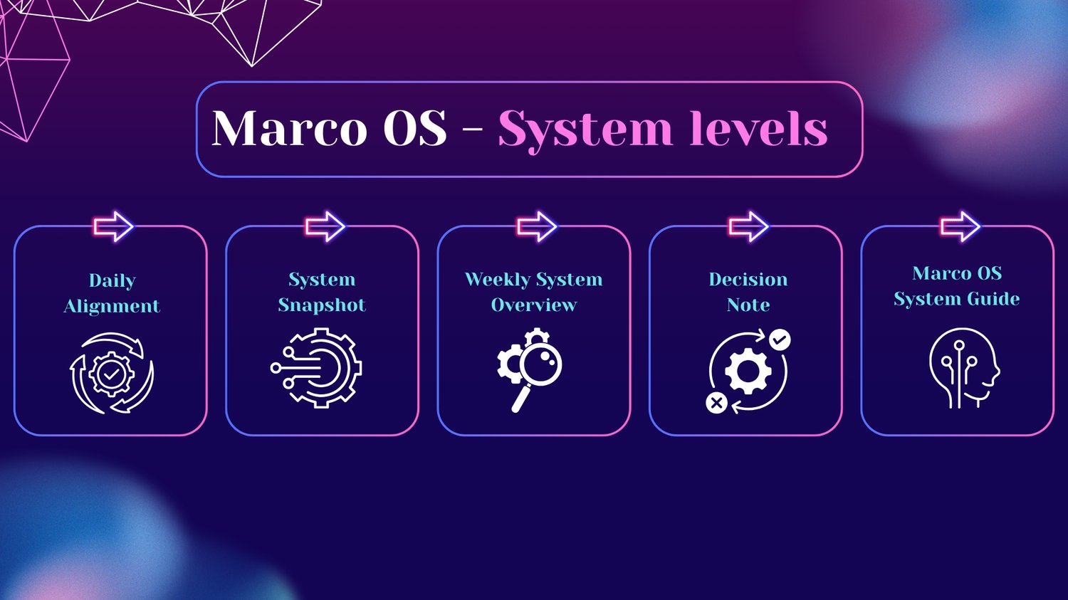 Built around a clear weekly structure and momentum-based logic, Marco OS supports focus, clarity, and sustainable productivity – without constant pressure or overwhelm.