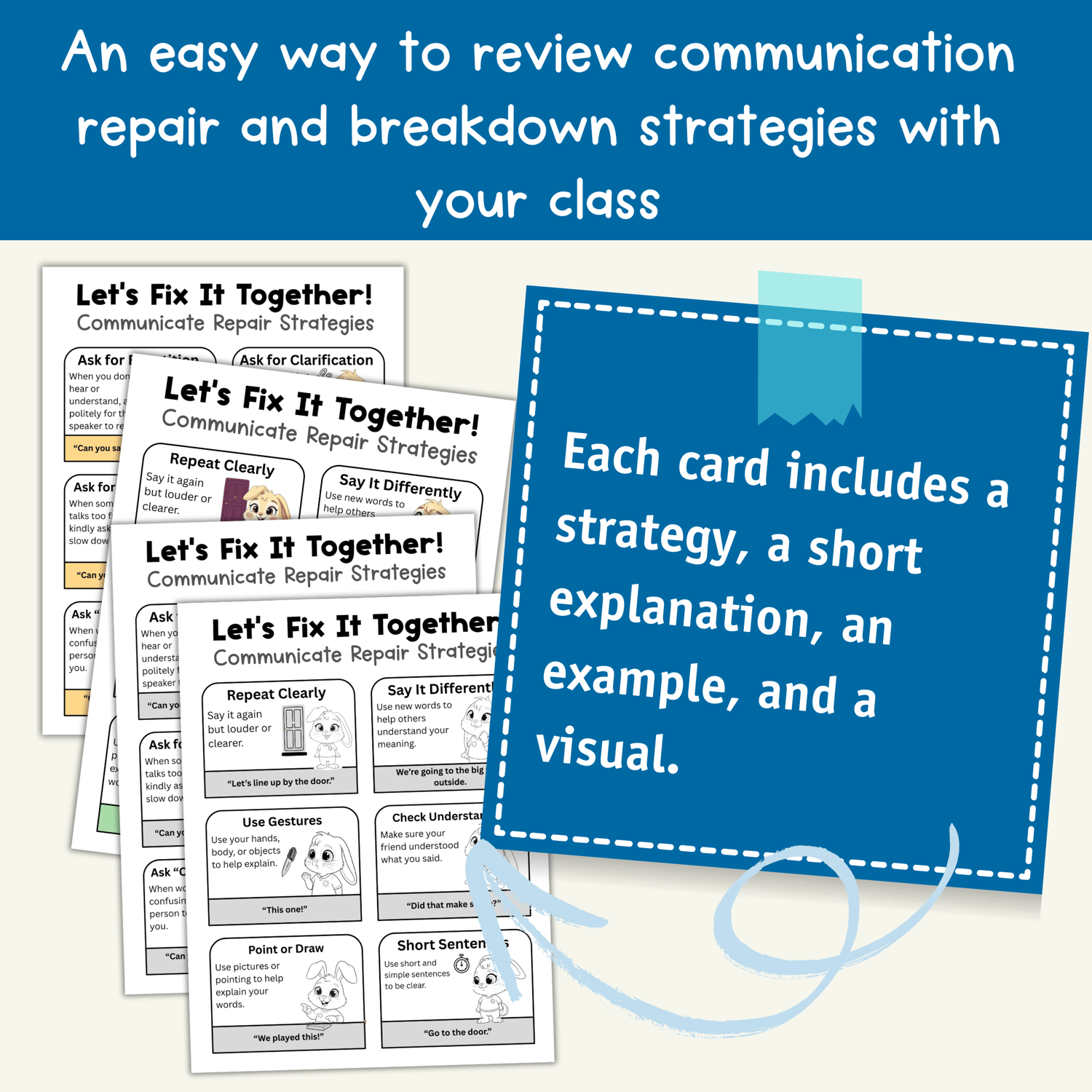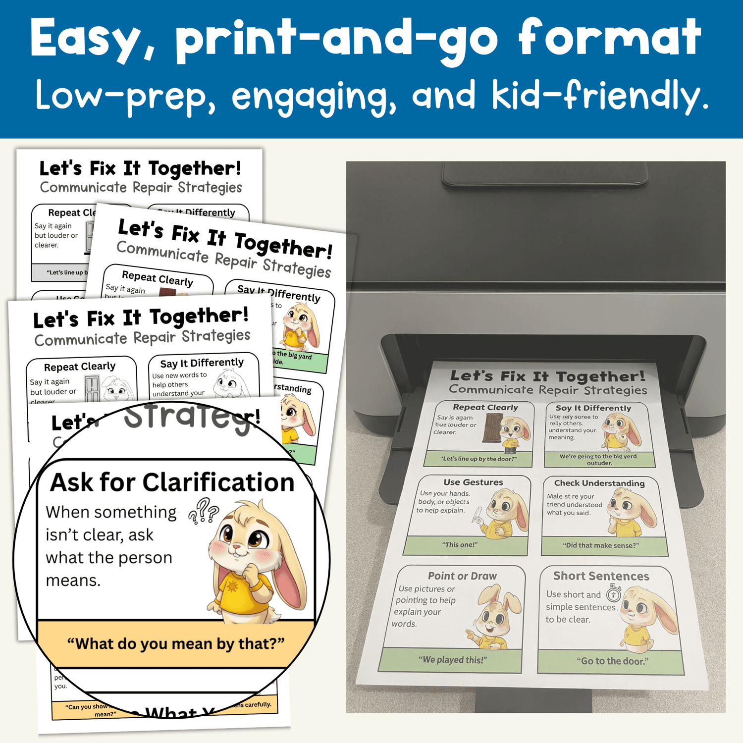 So many students struggle to fix communication breakdowns, and so this visual set makes learning repair strategies easy and fun! So simple, colorful, and kid-friendly — Sunny the Bunny helps kids learn how to communicate clearly and confidently. 🐰💬