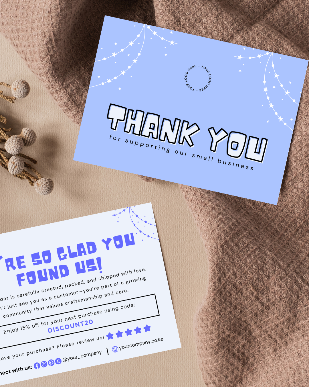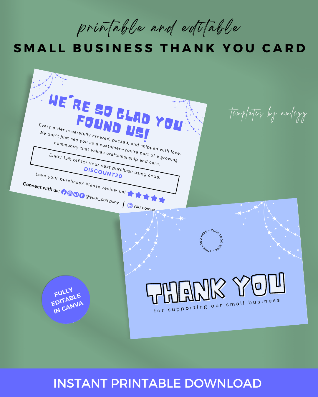 Perfect for online shops, Etsy sellers, handmade brands, and boutiques, this printable thank you card lets you easily customize your message, brand colors, fonts, and logo — no design experience needed. Simply edit in Canva, download, and print or send digitally.