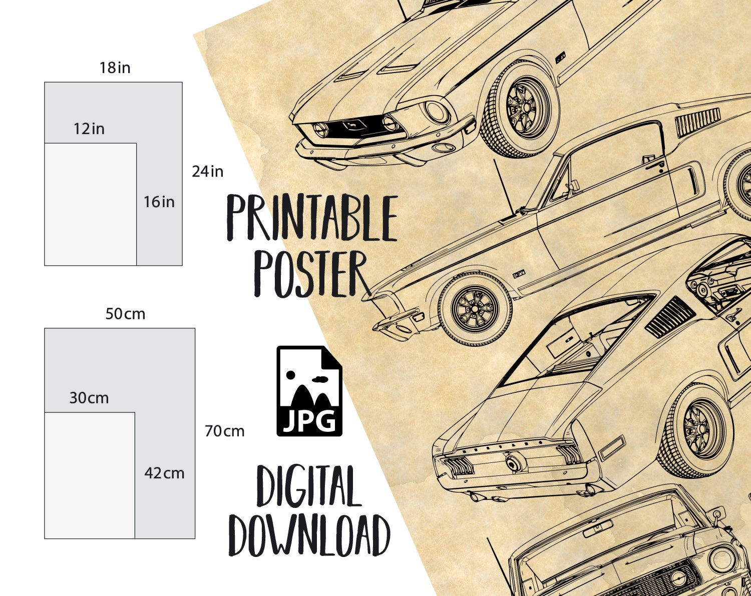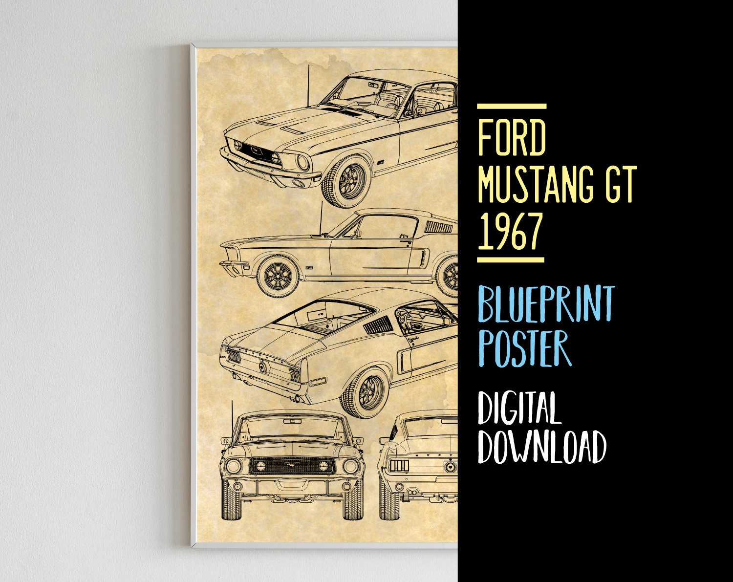 1969 Ford Mustang GT Blueprint Poster, Digital Download