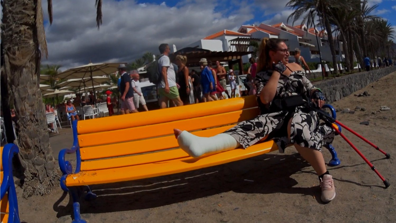 It’s been a whole morning of crutching in Spain for Penelope, she’s therefore right now letting herself take a rest by the beach in peace. Her right leg is broken and casted too, which makes it harder for her to move all day long. She gets up carefully and starts to crutch into the busy street looking for some lunch. She orders her food at a local stand by herself as she holds her casted foot up from the ground. Some great closeups were done as we wait for her, a bunch of tourists are passing by every second. She finally got her food and is now on her way to find a good spot where she can sit down and eat in the shades. Watch as she leads the way down the crowded street.