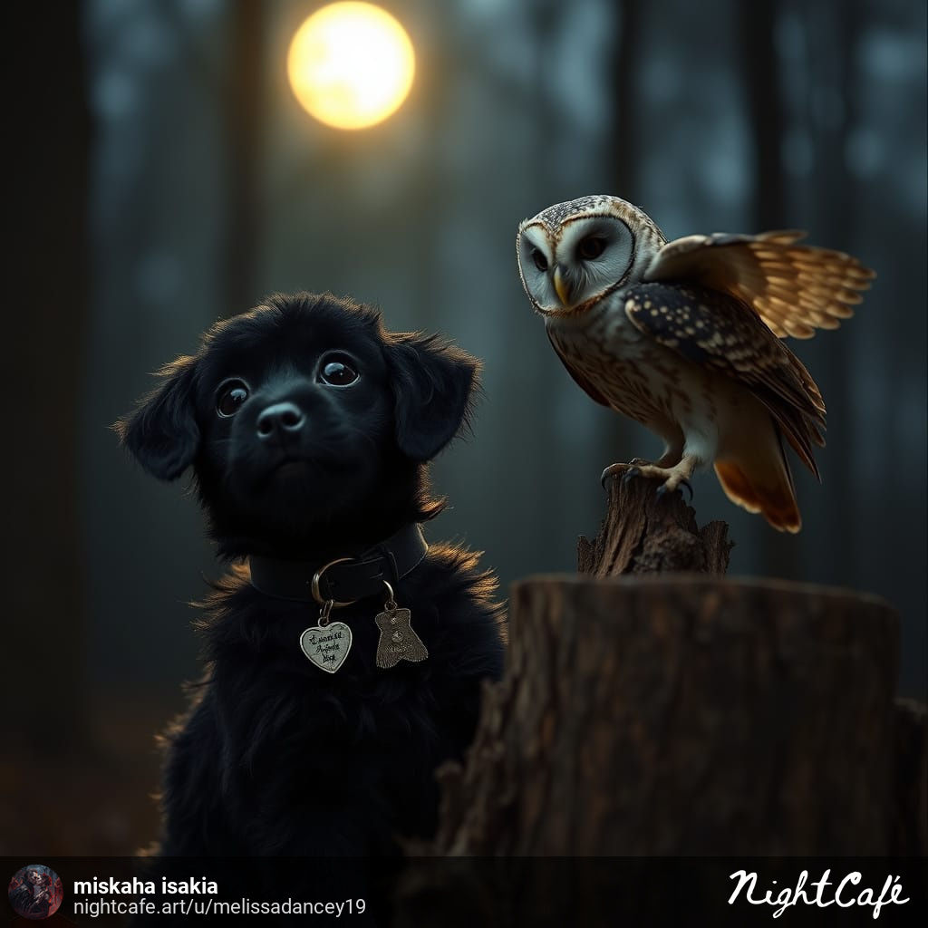 https://creator.nightcafe.studio/creation/jlvH6EGxorZEIpVVYtr6/an-owl-teasing-a-little-black-dog-on-the-ground-in-mid-of-night?ru=melissadancey19