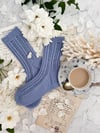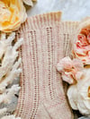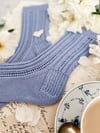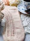I’ve named these socks after our precious abalone and their shimmering shells. The inside of an abalone shell has flashes of pink, white, silver, green, blue, and purple. It ripples and sparkles in the light, a sensory experience I’ve tried to replicate with the rows of eyelets and twisted stitches you’ll find in these socks.