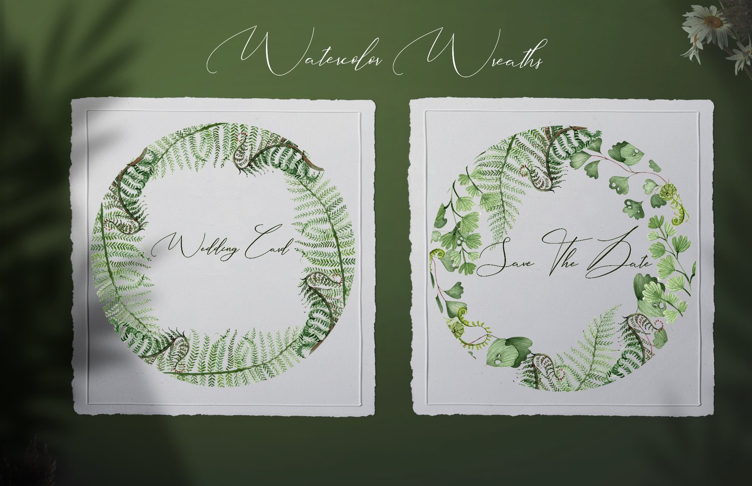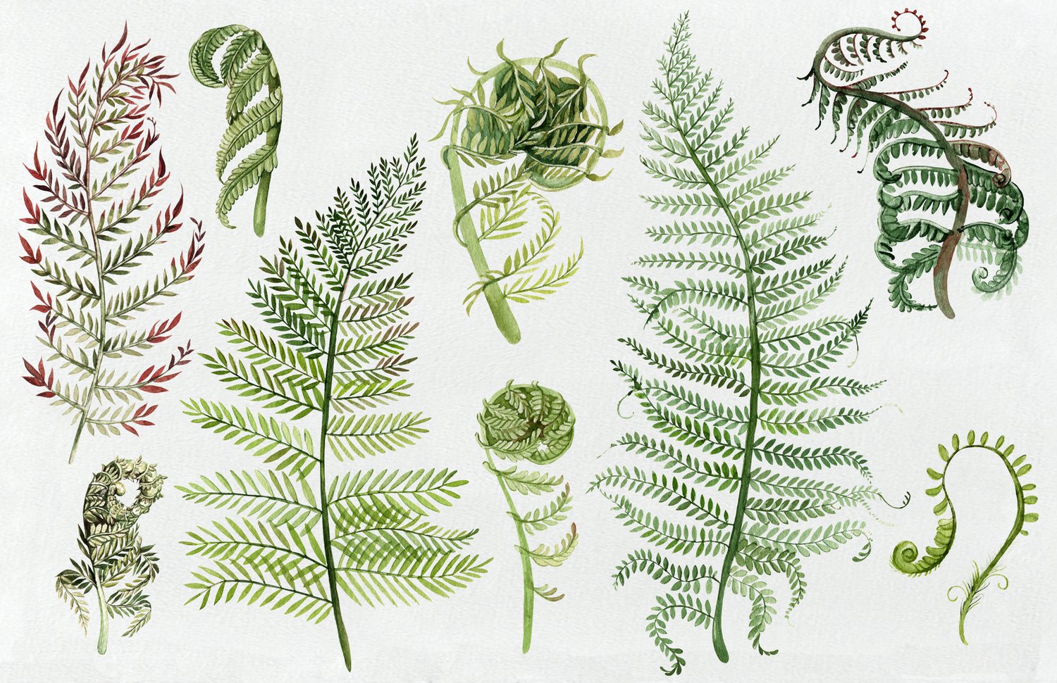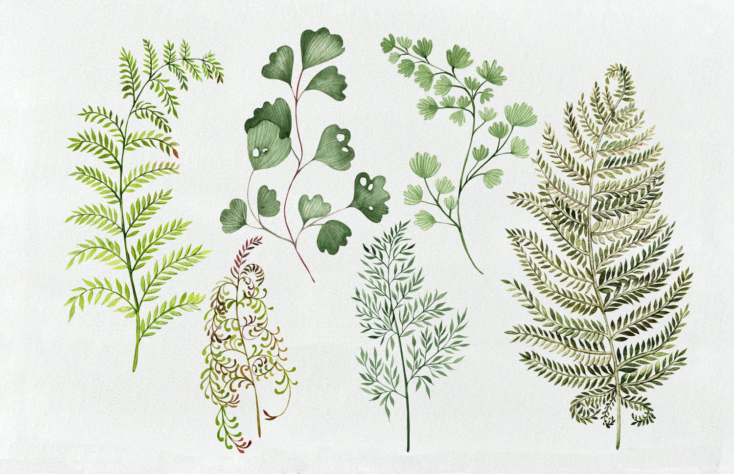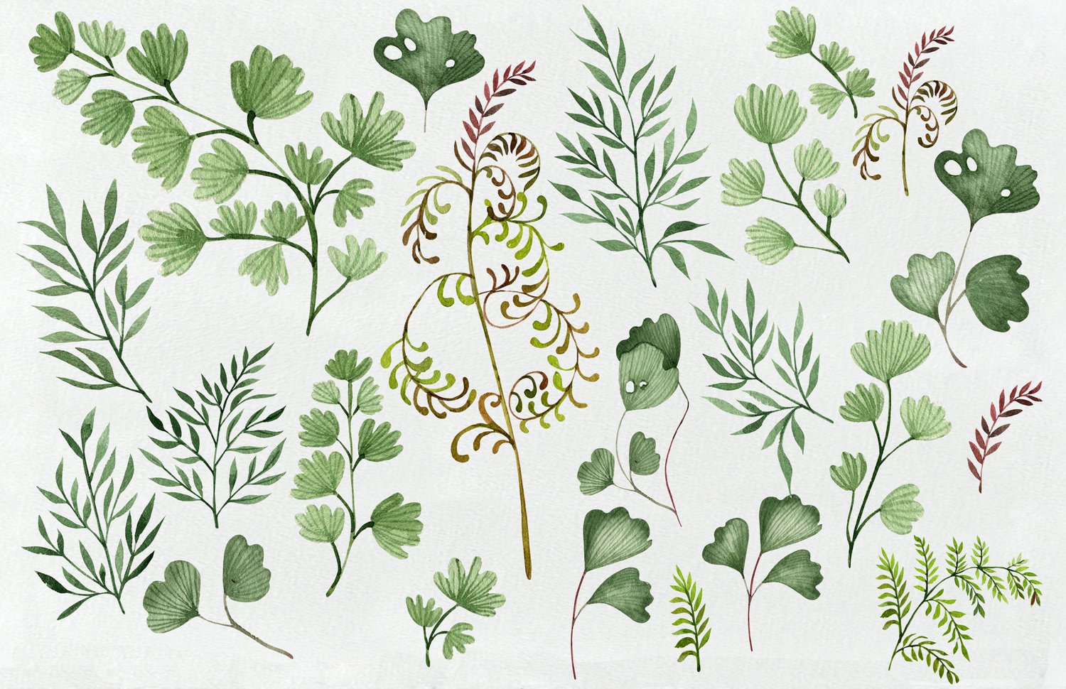 New collection of 61 png elements in various shades of green, hand-painted with watercolor.