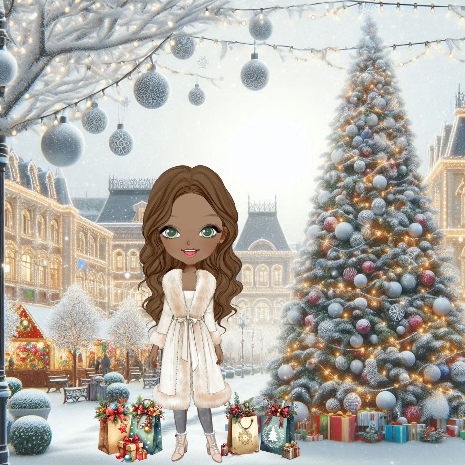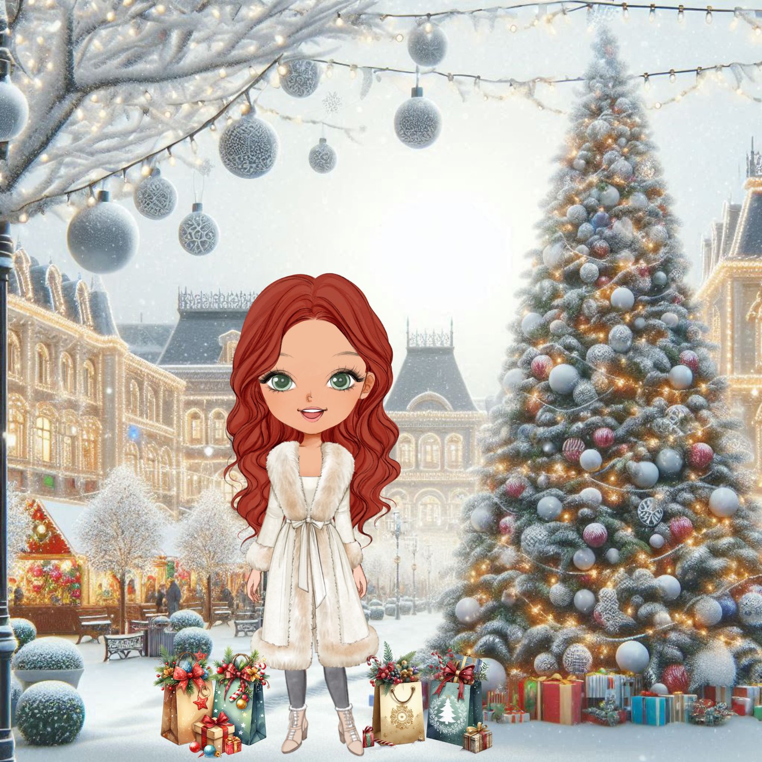 It's time for festive shopping with Molly in her winter coat. The design is available in various skin tones, four hair and eye colors, and includes Molly along with bonus Christmas shopping bags and a mix-and-match background.
