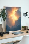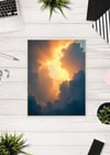 This captivating image showcases a dramatic sky filled with voluminous clouds illuminated by golden sunlight. The interplay of light and shadow creates a sense of awe and wonder, capturing the beauty and power of nature. The sun's rays pierce through the cloud cover, creating stunning sunbeams that add depth and dimension to the scene. This image was created using AI as a visualization tool.
