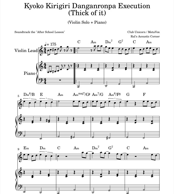 Kyoko Kirigiri Danganronpa (Thick of it) | Violin Piano PDF Audio