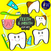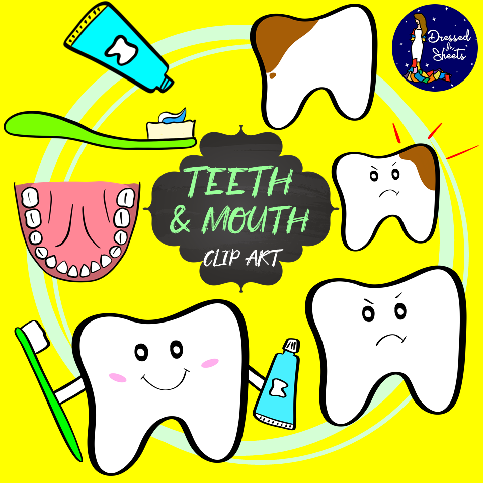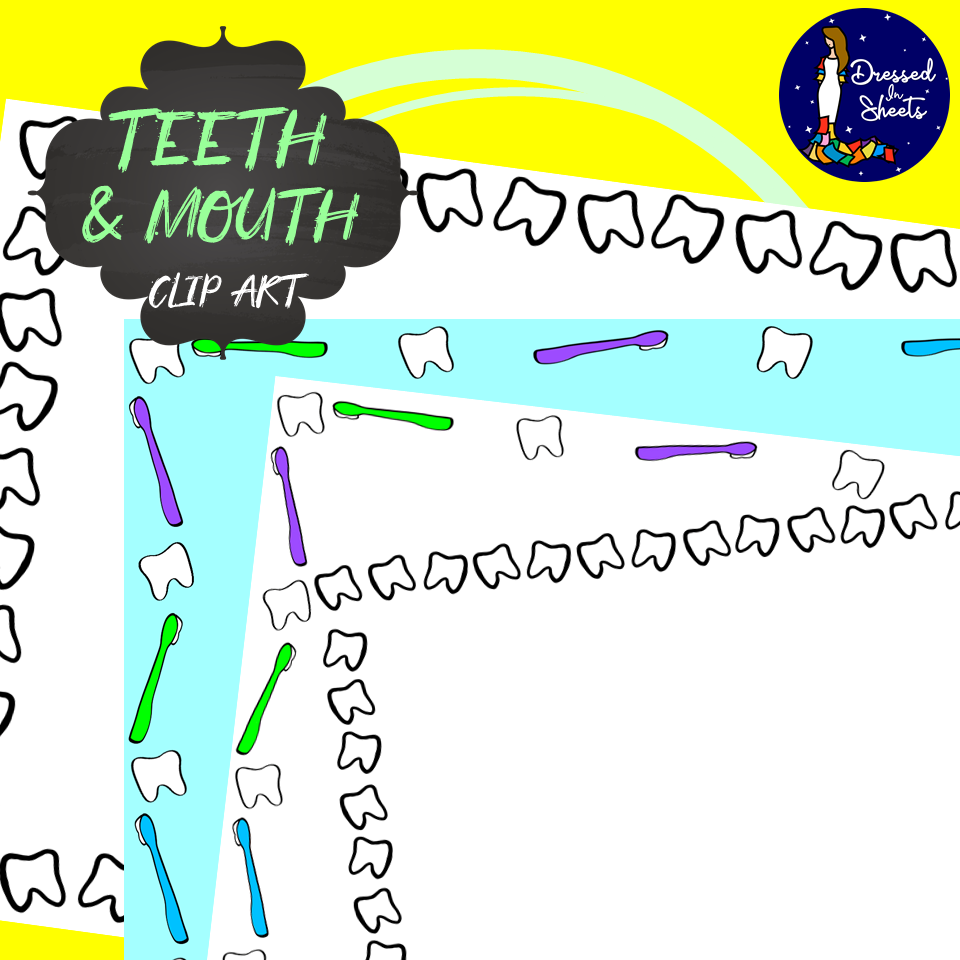 Mouth and Teeth Clip Art includes tetth being brushed, floss, floos with lettering, happy tooth, plaque on teeth, clean smile, single tooth, single tooth with plaque, toothbrush, toothpaste being dispensed on toothbrush, top view of bottom teeth, upset tooth, single upset tooth with plaque, teeth and toothbrush background, teeth border no fill, teeth and toothbrush background with no fill, teeth border with fill.
