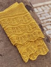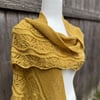 Use a needle that produces a blocked fabric with a look and drape that you are happy with. Gauge is not crucial to this pattern, but keep in mind that variance in gauge will also affect the amount of yarn used as well as the overall size of your shawl.