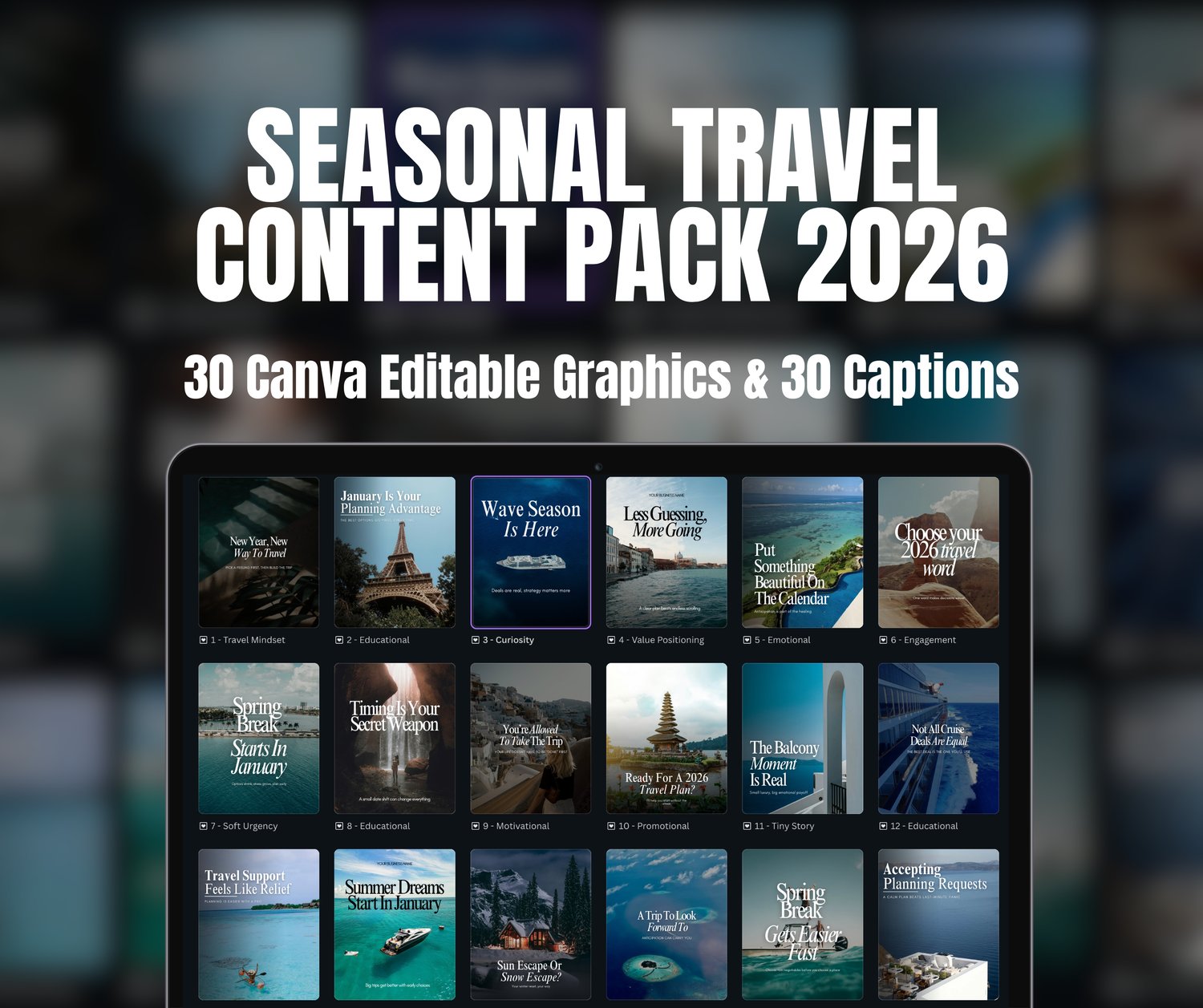 Seasonal Travel Content Pack 2026 gives you calm, polished content built around real travel planning rhythms, so you can stay consistent without sounding salesy or scrambling for ideas.