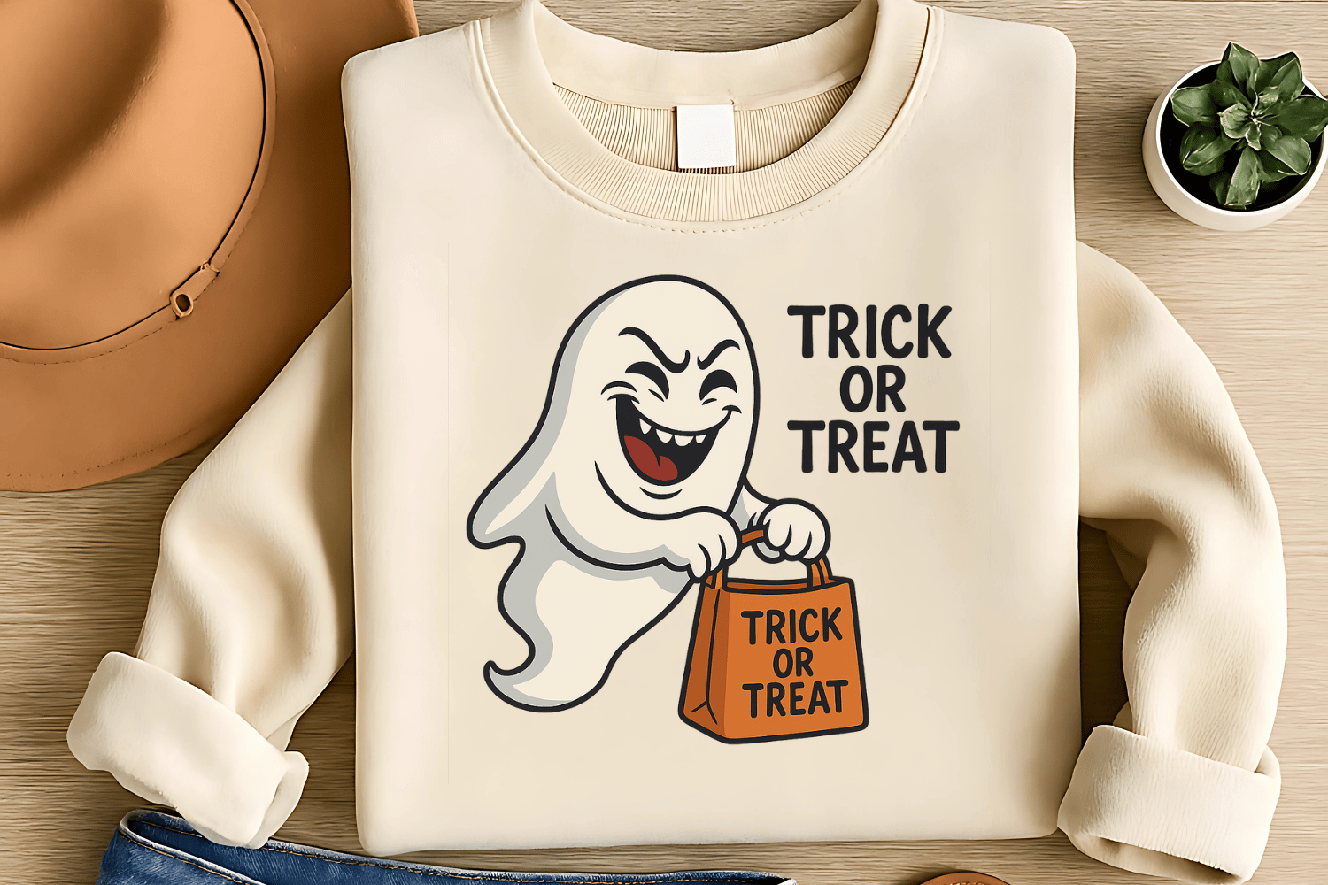 Haunted Laughing Ghost Sublimation PNG – “Trick or Treat” Funny Halloween T-Shirt Design – Playful & Spooky – 300 DPI Instant Digital Download
