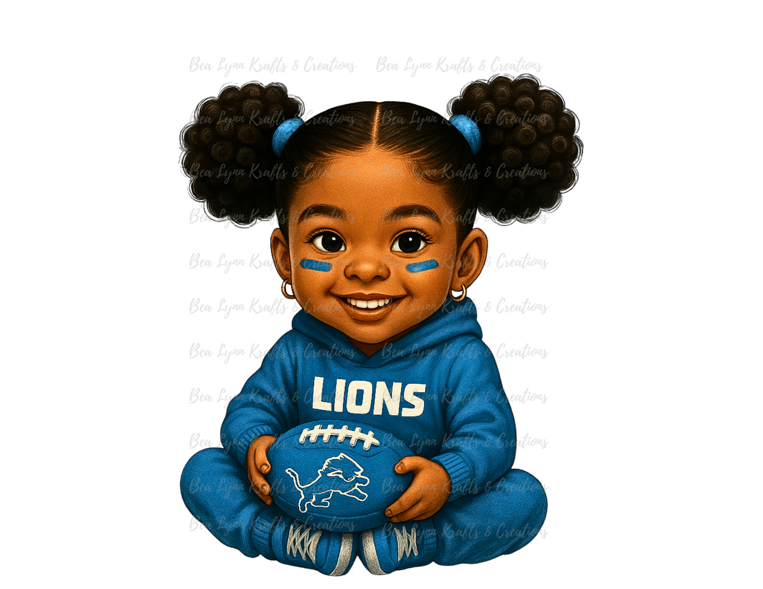 This Detroit Lions Baby Girl PNG features an irresistibly cute 3D-style cartoon toddler sitting happily while holding a Lions-themed football. She wears a cozy blue Lions hoodie with matching joggers and sneakers, complete with blue face paint that shows her team spirit. Her two fluffy puff buns, gold hoop earrings, and bright smile give the artwork a heartwarming and polished look.