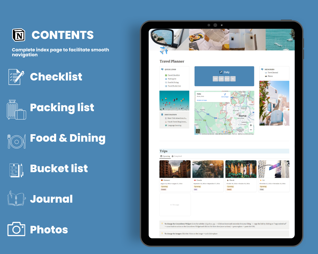 - Fully Customizable: Tailor every section to match your unique travel needs, whether you're headed to one location or exploring multiple destinations.