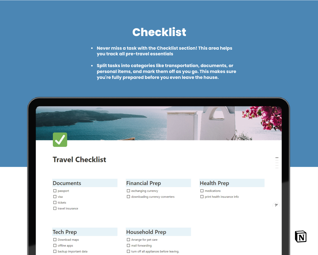 - Checklist: Easily manage pre-travel tasks like bookings, confirmations, and important reminders to ensure everything’s ready before you go.