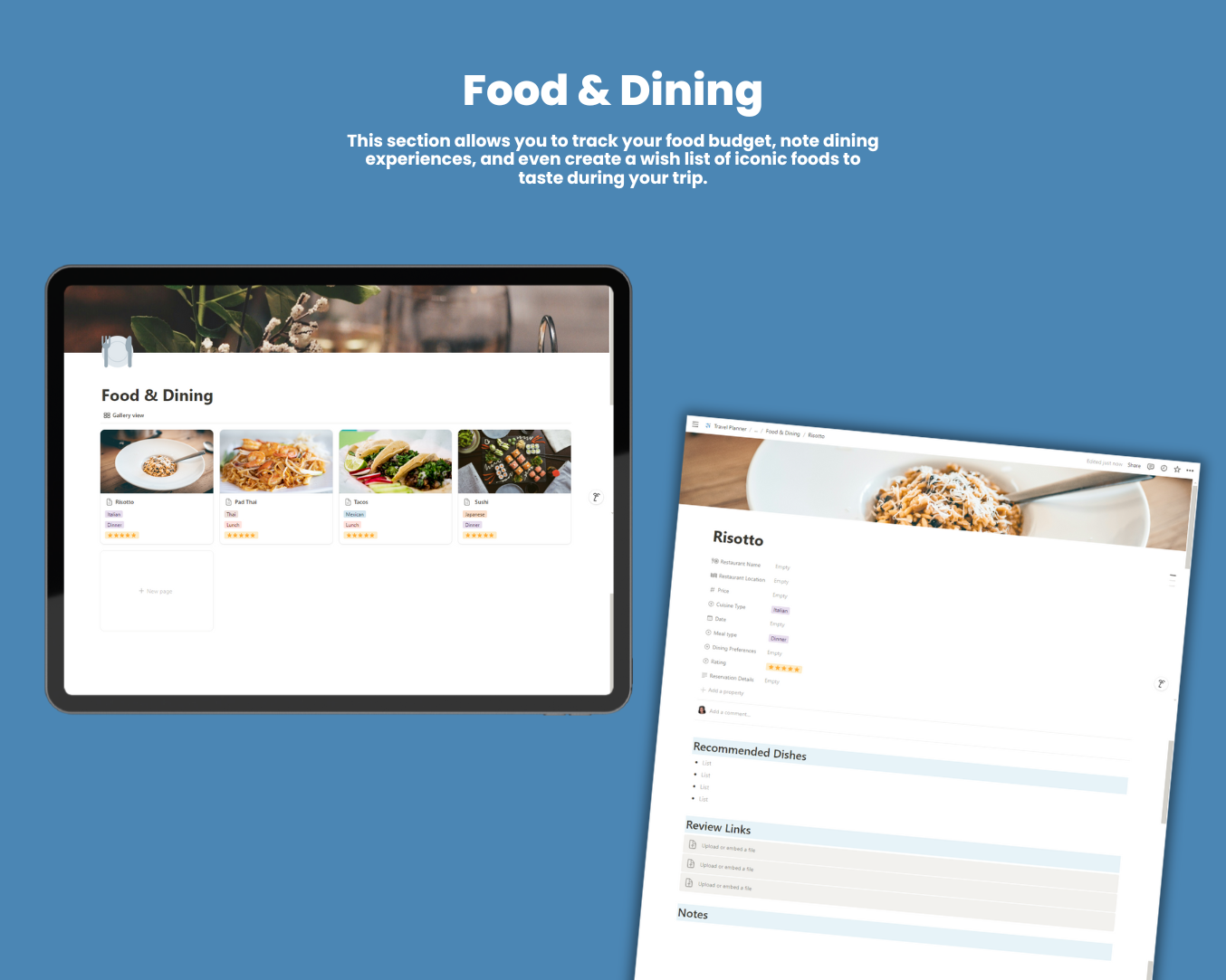 - Food & Dining Guide: Plan your culinary adventures with sections for must-try dishes, favorite restaurants, and even meal reservations.