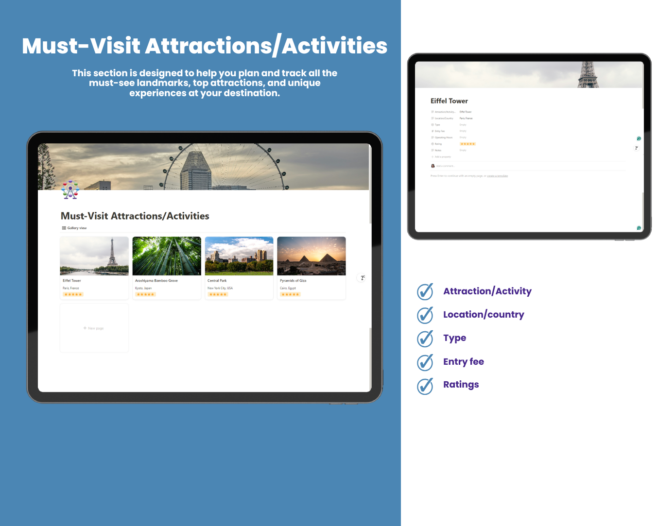 - Must-Visit Attractions & Activities: Plan must-see landmarks, unique experiences, and local events, so you can make the most of every destination.