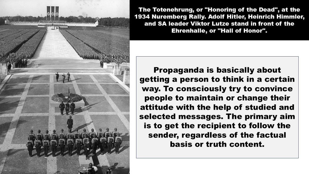 Propaganda is basically about getting a person to think in a certain way. To consciously try to convince people to maintain or change their attitude with the help of studied and selected messages. The primary aim is to get the recipient to follow the sender, regardless of the factual basis or truth content.