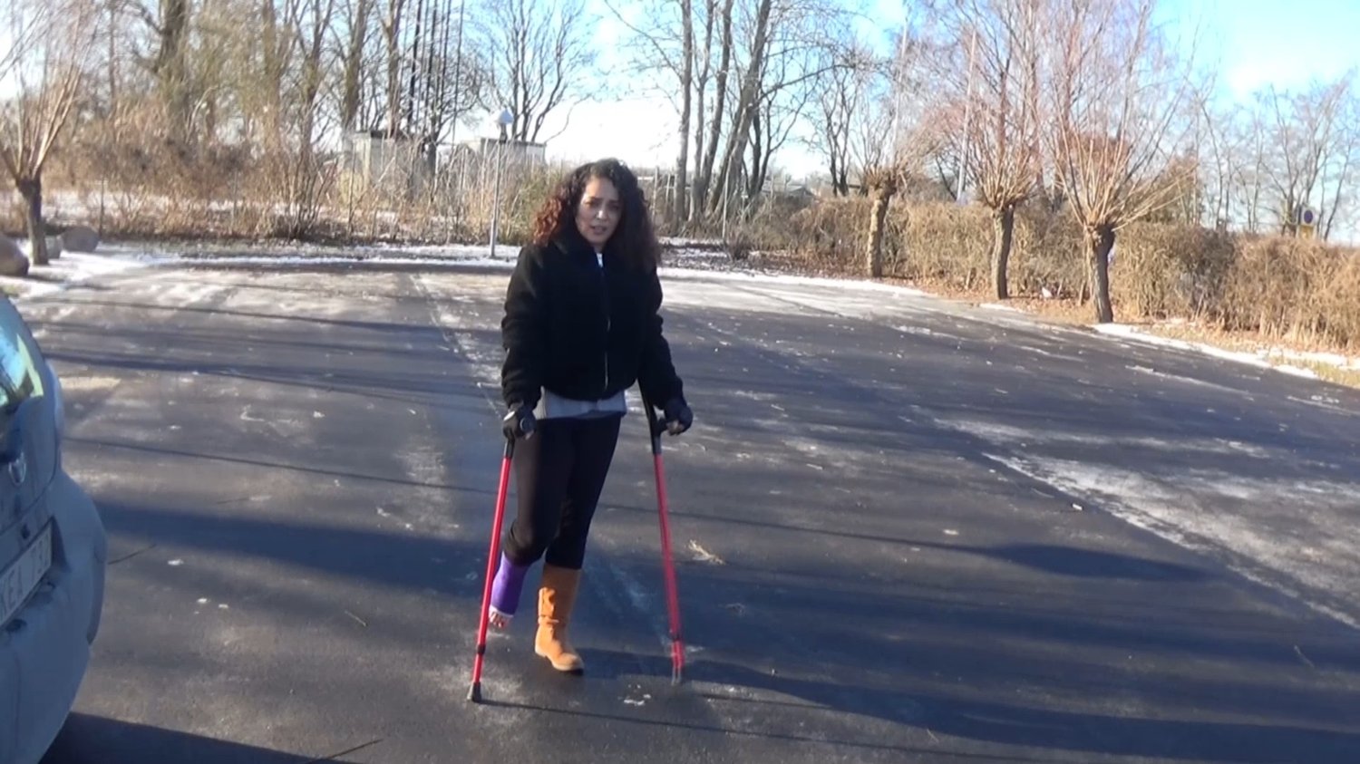 It´s a cold day in Sweden with some snow still on the ground when we say hello to our new model Alexie.Alexie has a purple SLC on her right leg but she has no sock over her toes even if it´s a bit cold for her.
