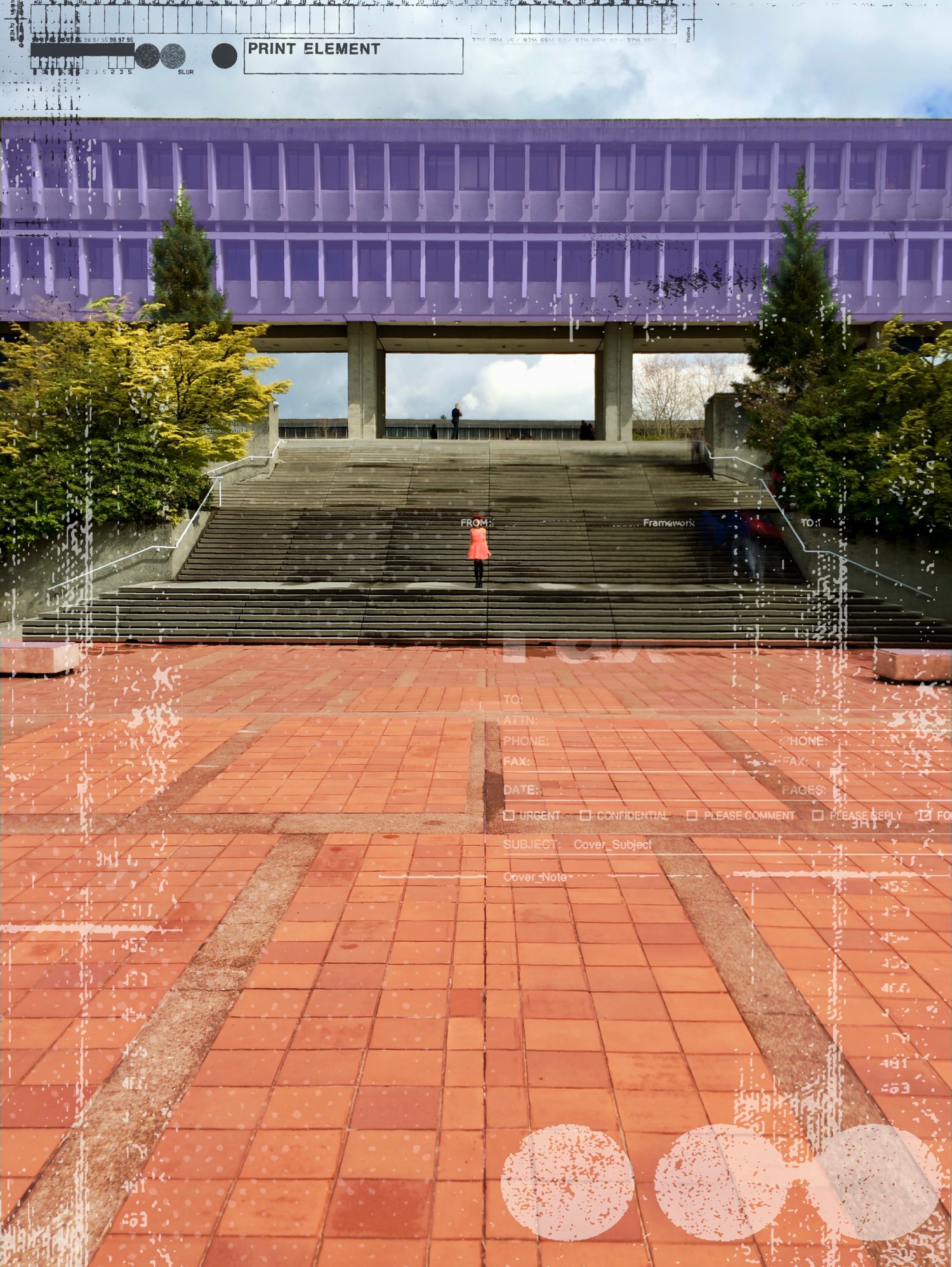 A lone figure in a coral coat stands on a vast set of concrete steps, framed by brutalist architecture, glossy purple windows, and grids of worn fax markings that ghost across the scene. The strong lines of the red tile plaza pull your eye inward, turning this into a graphic study of scale, solitude, and quiet urban drama.