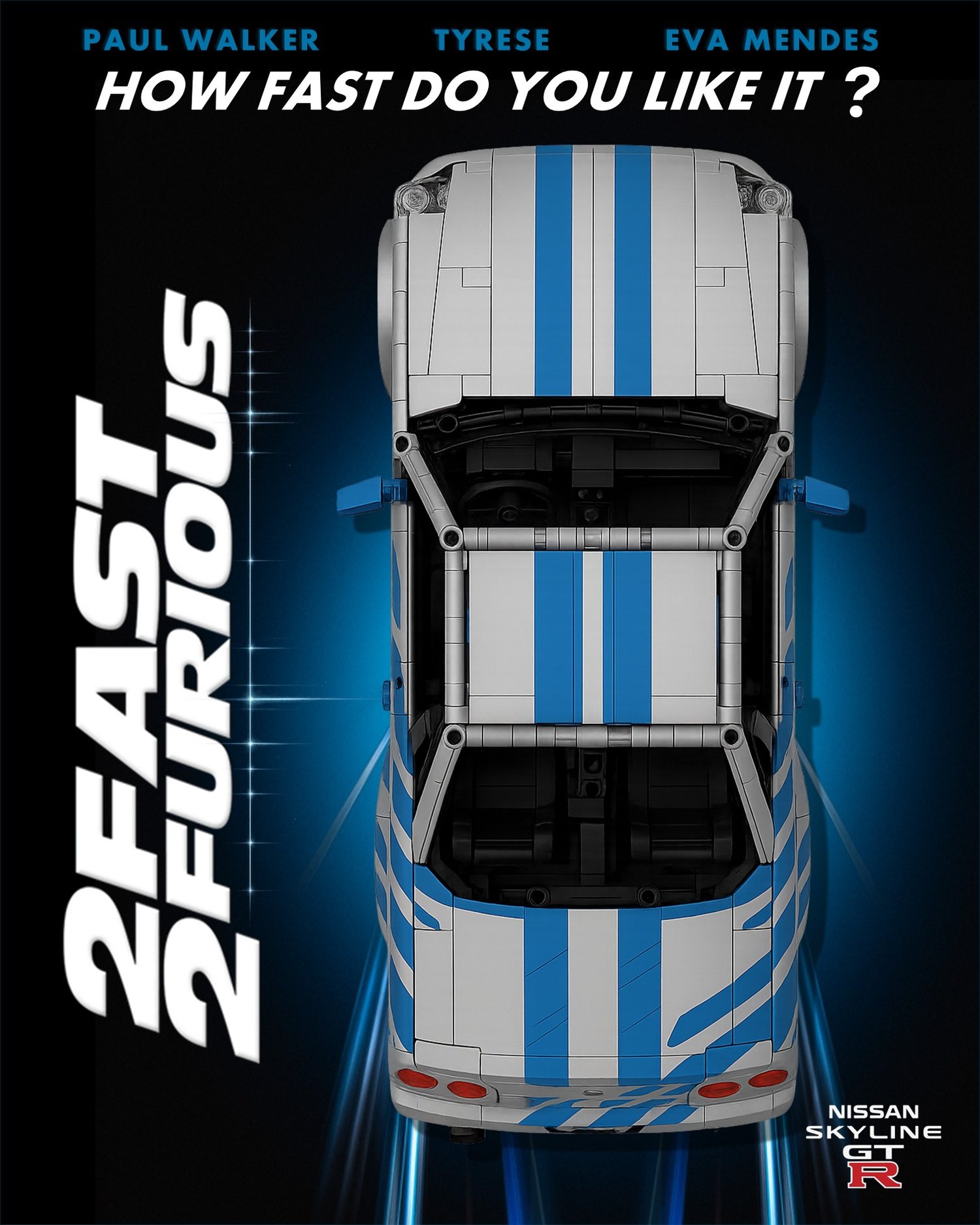 Voici une affiche verticale exclusive conçue pour le set LEGO® Technic 42210 – la mythique Nissan Skyline GT-R de Brian O’Conner dans 2 Fast 2 Furious !