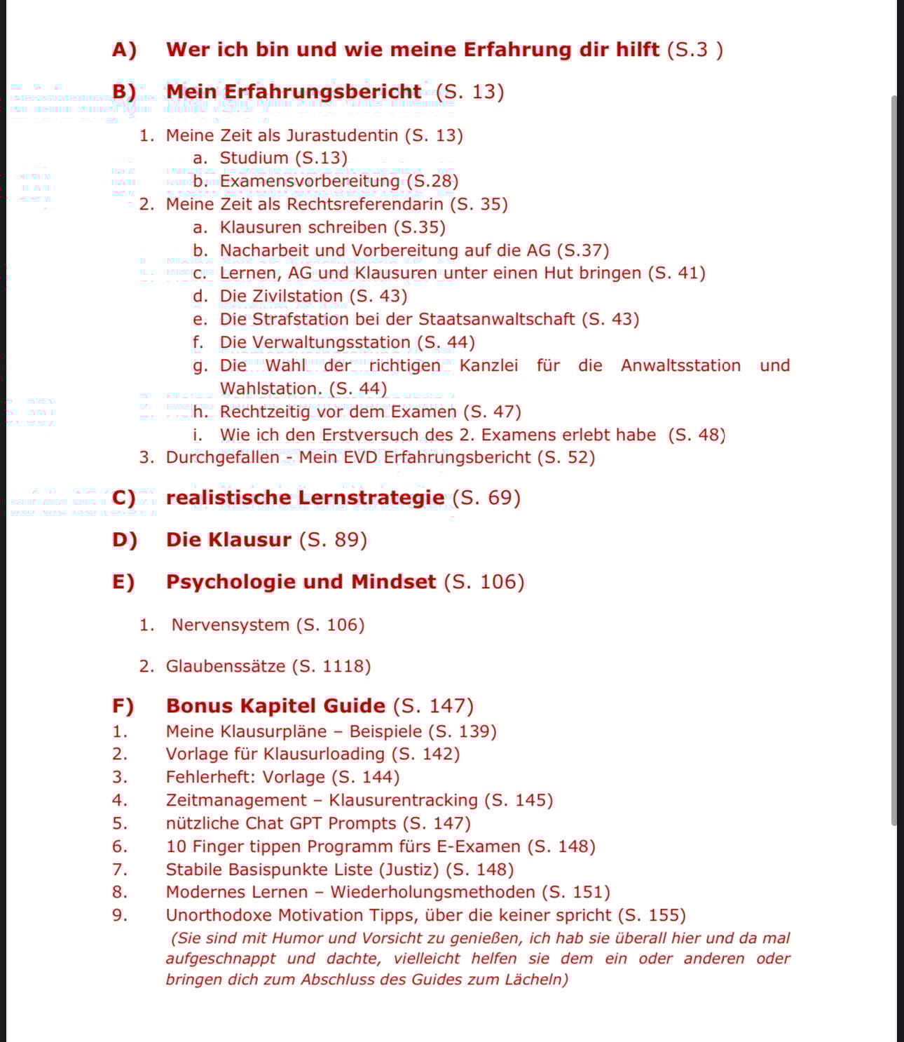 Ich habe auf circa 150 Seiten meine Reise durch die juristische Ausbildung beschrieben, mit allen Fettnäpfen und Fehlern, die ich machen konnte - Damit du einen echten Erfahrungsbericht hast und davon verschont bleibt.