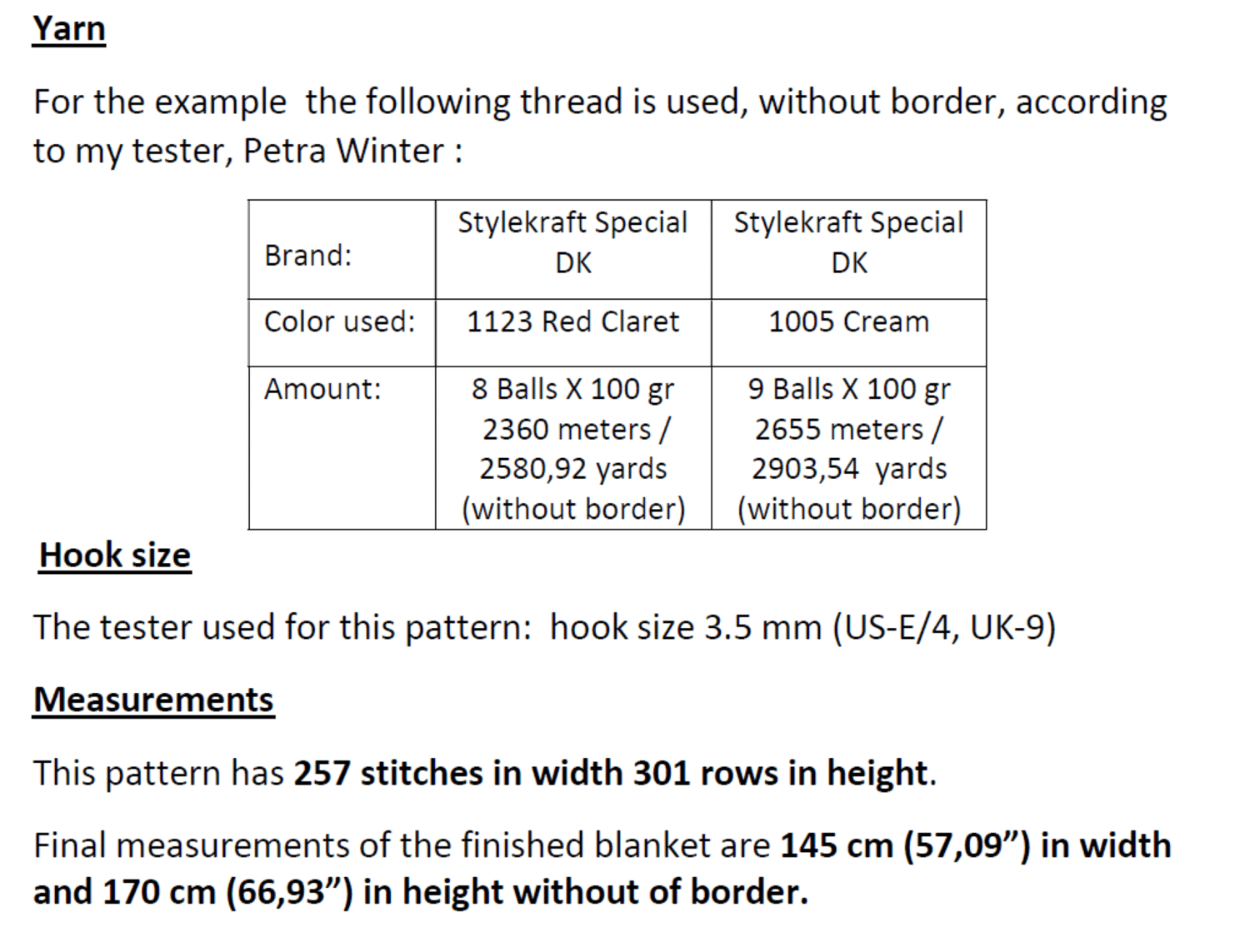 The amount of yarn used for this pattern by my tester without the border was: 2360 meters / 2580,92 yards (colour 1123 Red Claret) and 2655 meters / 2903,54 yards (colour 1005 Cream)