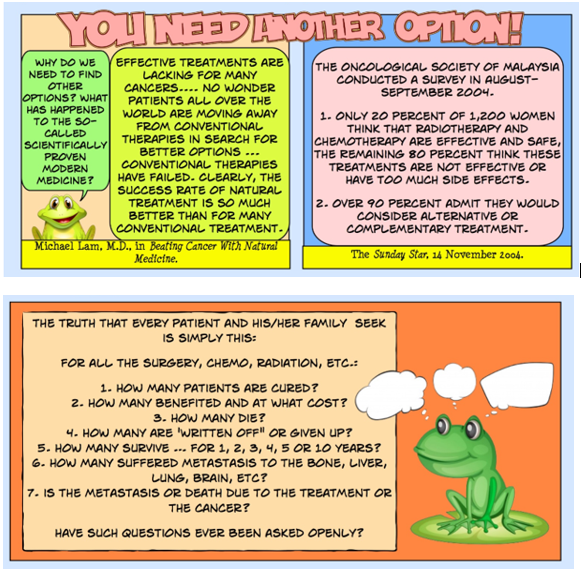 In this 36-page booklet I have tried to give you all the information that you need to know about the medical treatment of cancer. This will fill in the gap that the oncologists do not tell you. The facts and opinions in this book are not “cooked up” or merely my imagination. They are all quoted from books or medical journals. Bitter and hard to swallow, these truths have to be told. I hope this information may help you make a wise decision. It is your life!