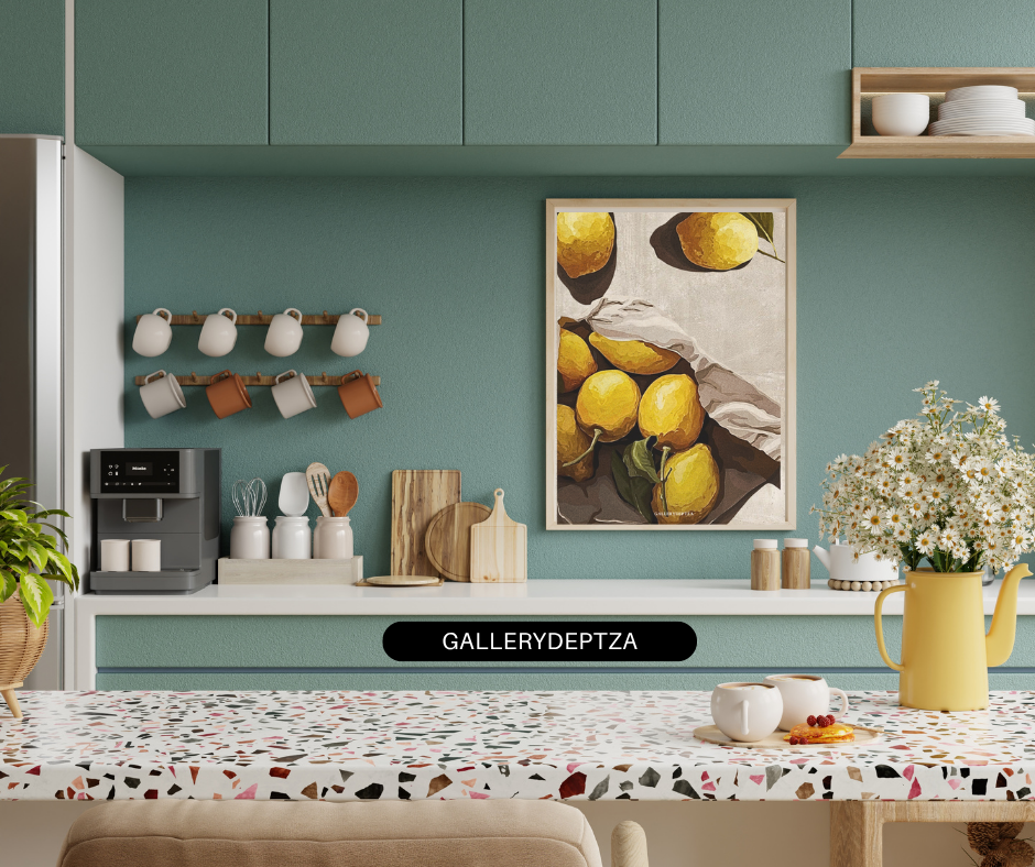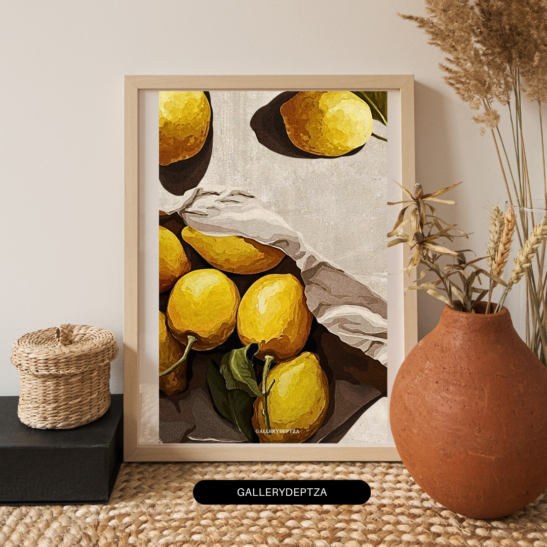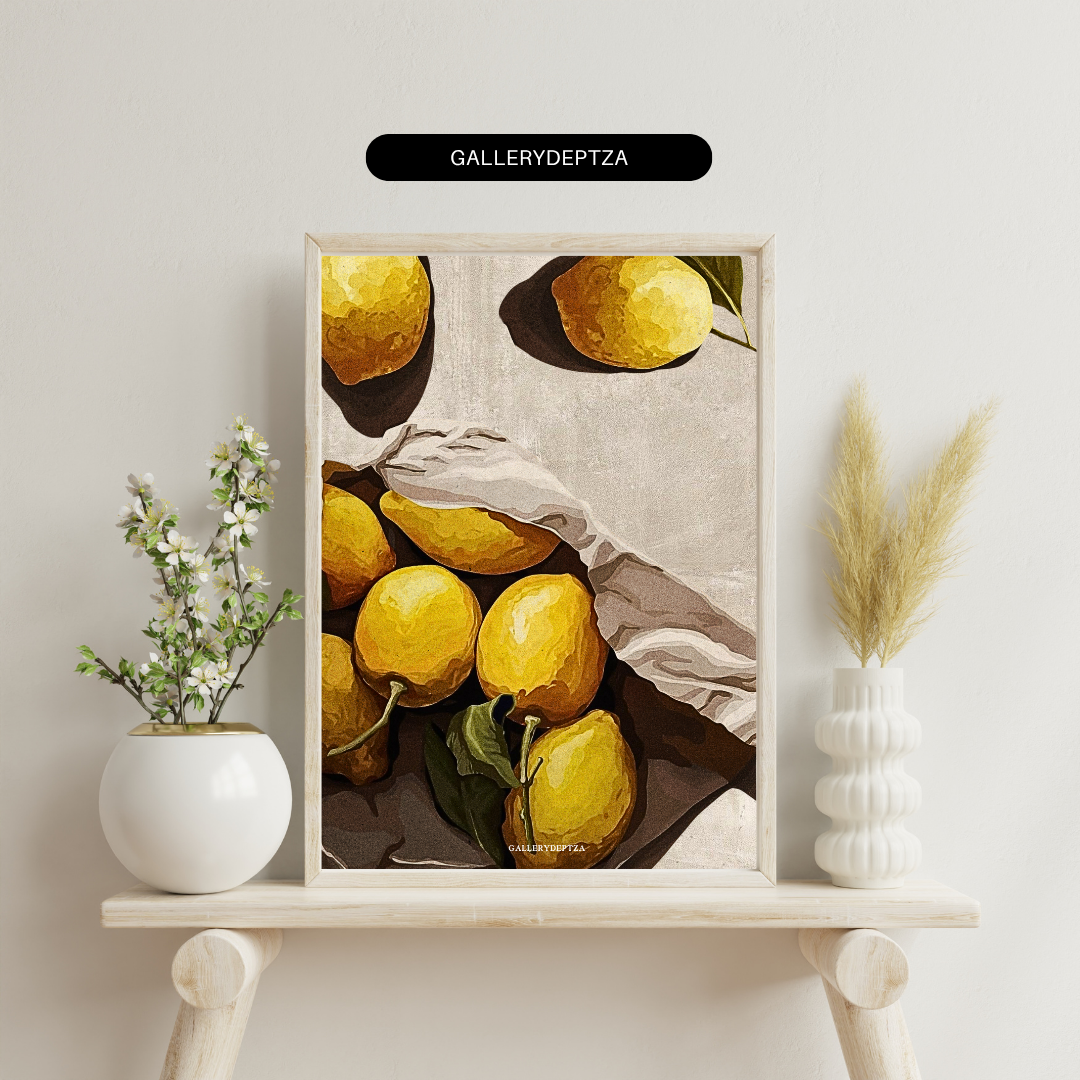 Brighten your kitchen or dining area with this lemons in a brown bag poster, beautifully set against a soft, neutral textured background. This minimalist yet elegant design adds a refreshing touch of natural warmth to any home interior.