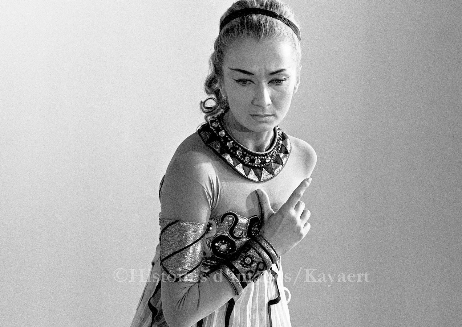 A stunning black and white photograph capturing Genia Melikova in a powerful moment from the 1962 performance of Lamenti. This image highlights the intensity and elegance of a unique artist in motion, preserved through the lens of Belgian photographer Robert Kayaert.