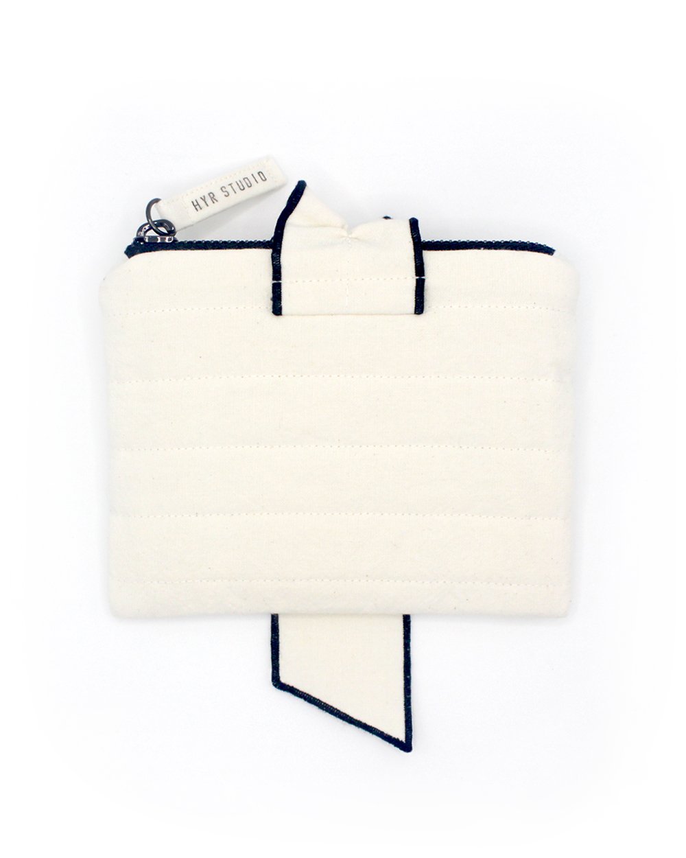 Un porte-monnaie matelassé en calicot lavé de haute qualité. Il se distingue par ses surpiqûres noires et son ruban central ajustable. Idéal pour transporter les petites pièces, cartes ou accessoires du quotidien. Fermée par une fermeture éclair métallique résistante, elle offre une excellente durabilité.