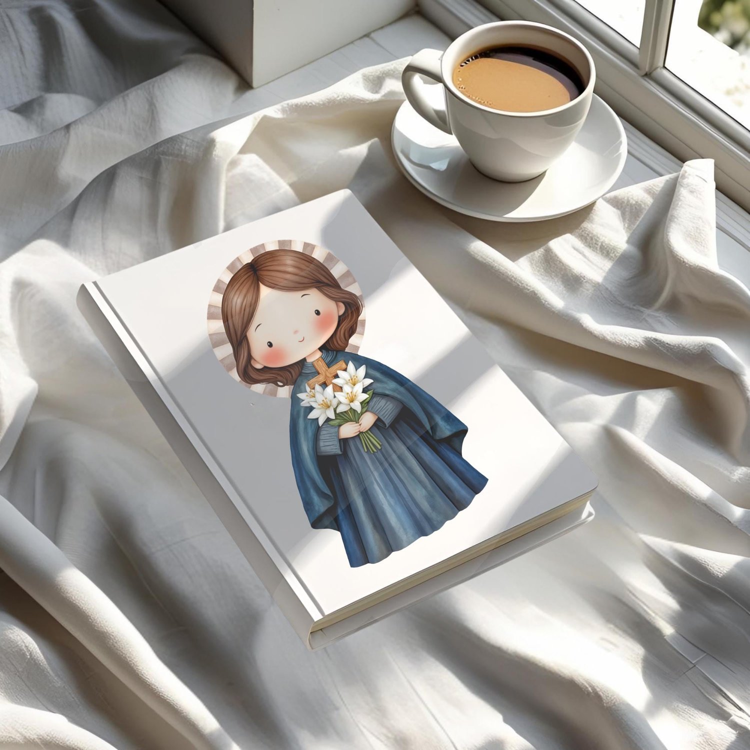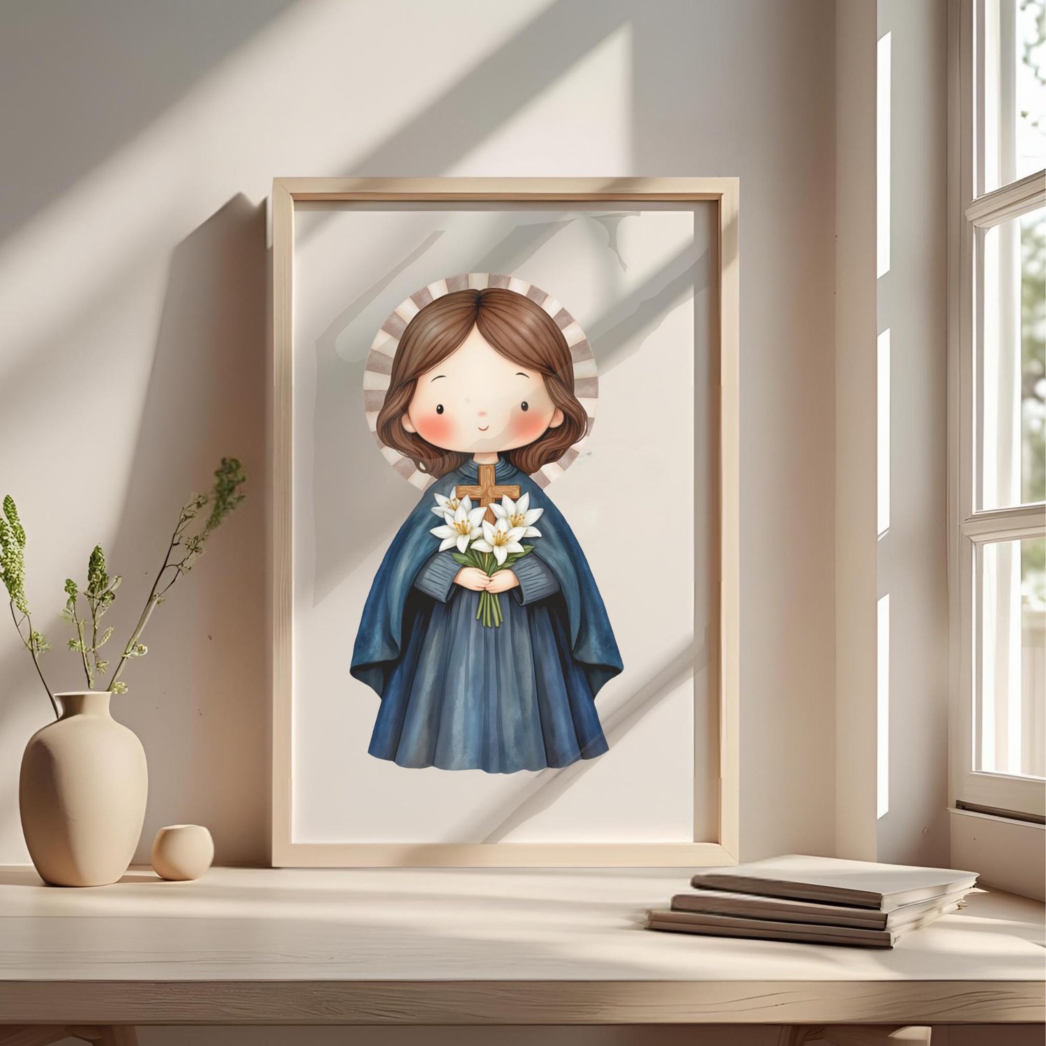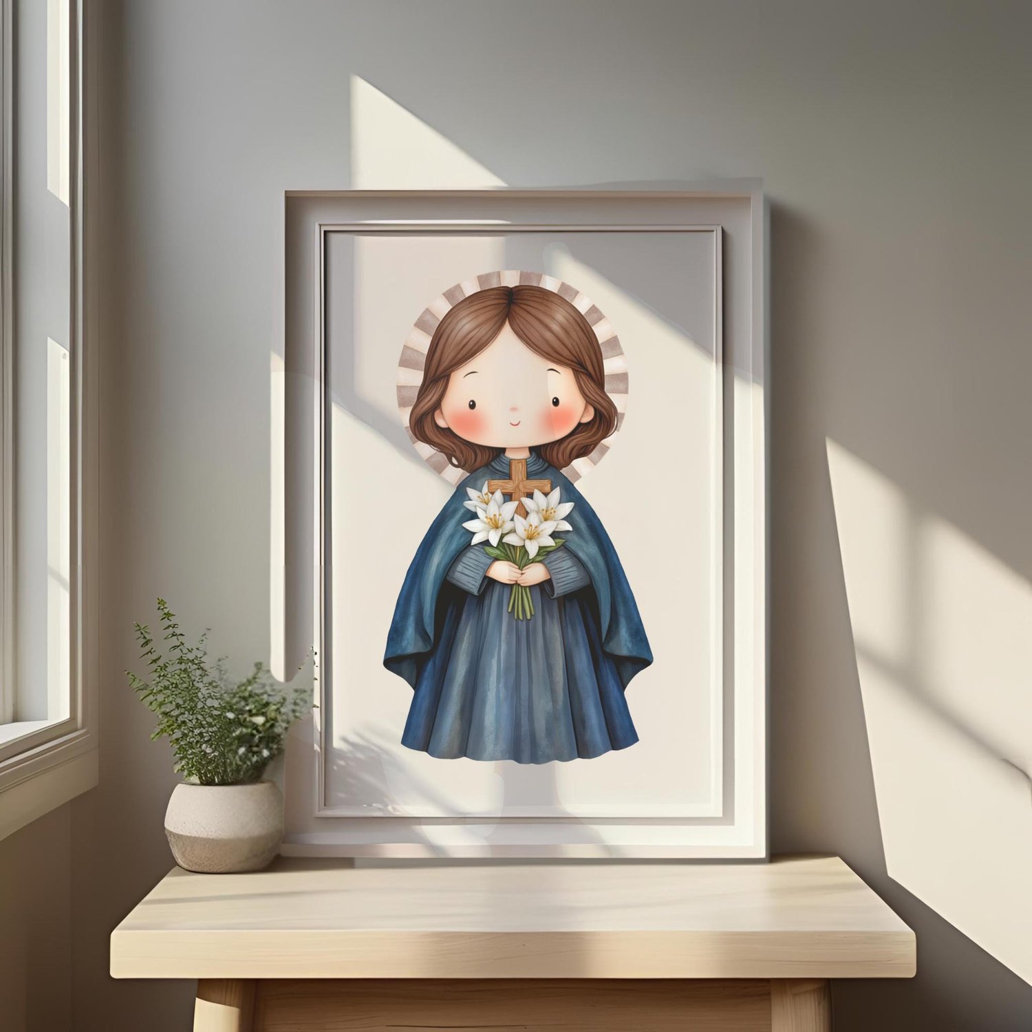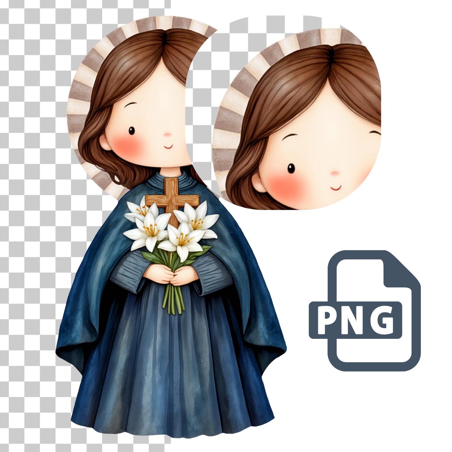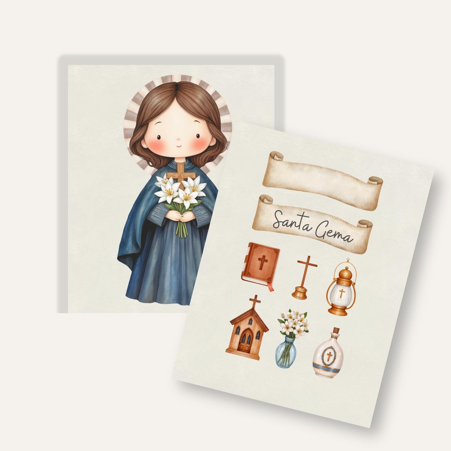 Conmemora a la querida Santa Gema Galgani, conocida como la "Flor de Lucca", con esta hermosa ilustración digital en acuarela. Su vida de profunda espiritualidad, devoción a la Pasión de Cristo y sus estigmas la convierten en un faro de fe y sacrificio. Capturada en un estilo tierno y delicado, esta imagen (junto con elementos complementarios) es perfecta para una variedad de proyectos creativos y devocionales.