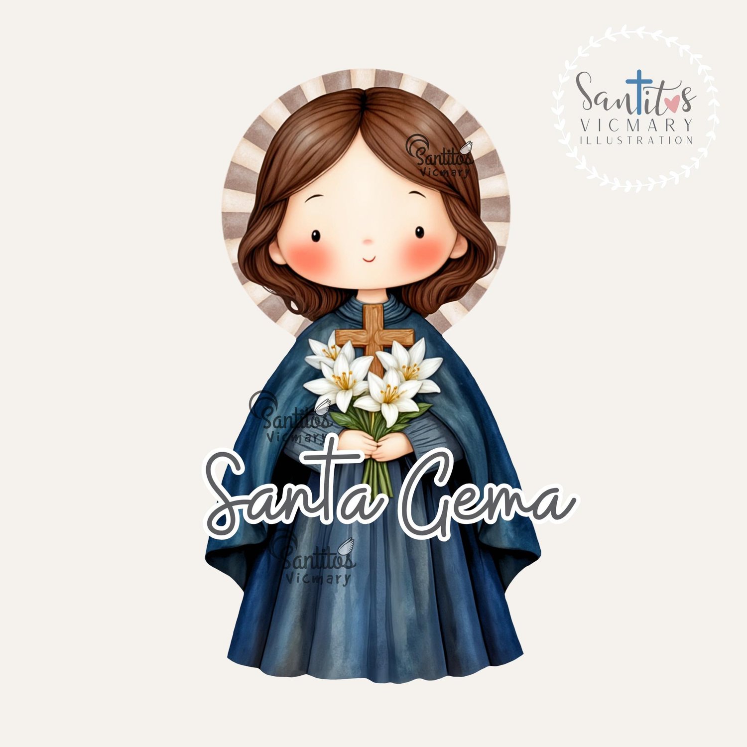 1x Ilustración completa con fondo: La imagen principal de Santa Gema Galgani con un sutil fondo de luz o un detalle floral, lista para imprimir o usar en redes sociales.