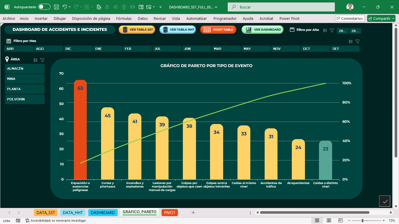 - Filtros dinámicos por mes, área o zona, y clase de evento (incidente peligroso, accidente leve, grave o incapacitante).