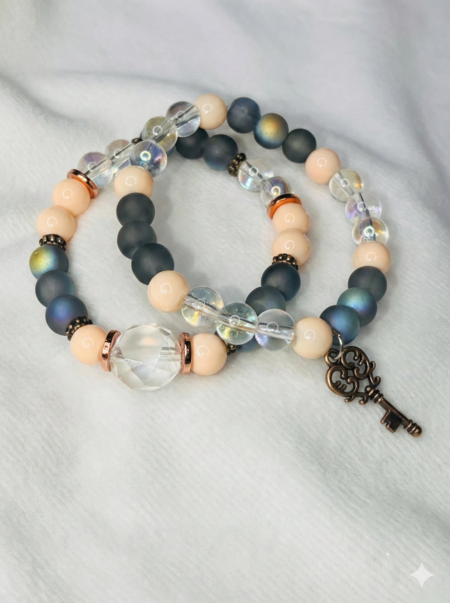 Sip on smoky sophistication with the Apricot Smoke Martini Bracelet—a girly stack of iridescent gray obsidian beads, peachy orange accents, rainbow aura quartz drops, and an antique bronze key charm that unlocks ethereal elegance. Handcrafted for feisty-feminine vibes, this lightweight piece blends peachy glow with mysterious shimmer like a chic cocktail after dark.
