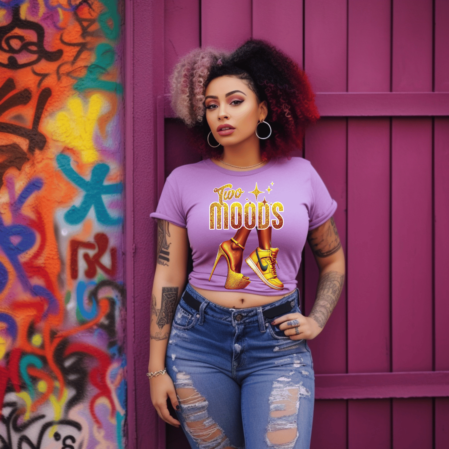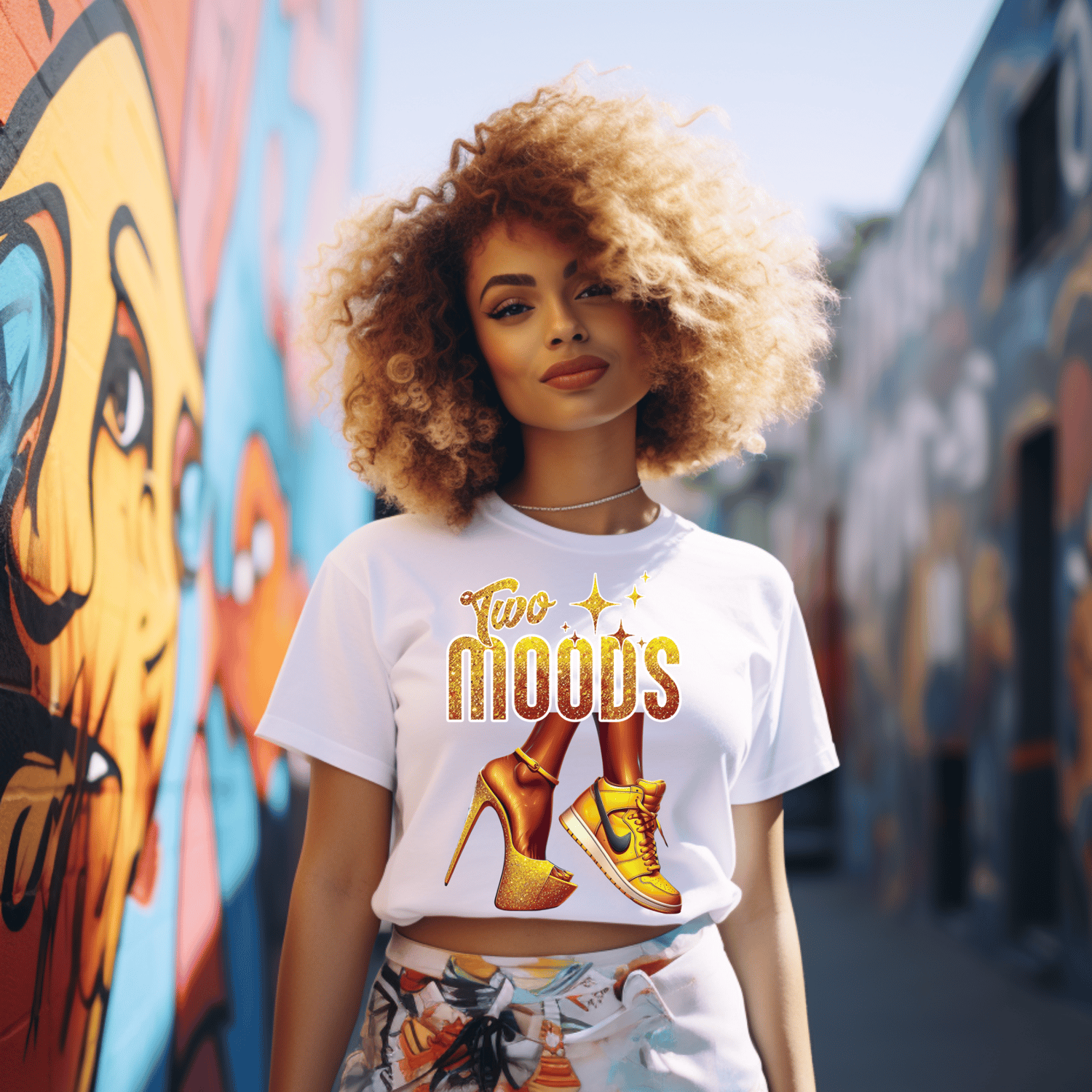 Shine bright in every mood with this gold glitter edition of “Two Moods”—a luxe digital design featuring a glam stiletto and street-savvy sneaker. Whether you're feeling classy or comfy, this design is perfect for T-shirts, and hoodies.