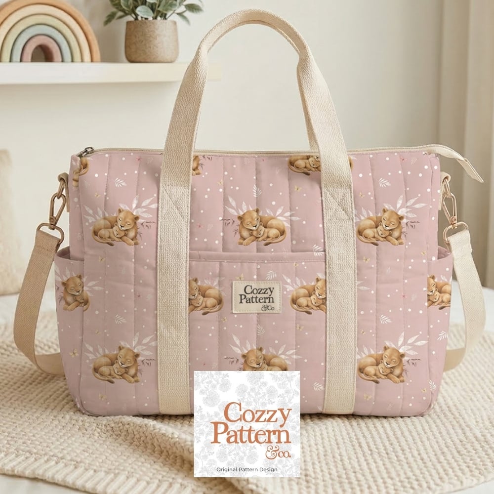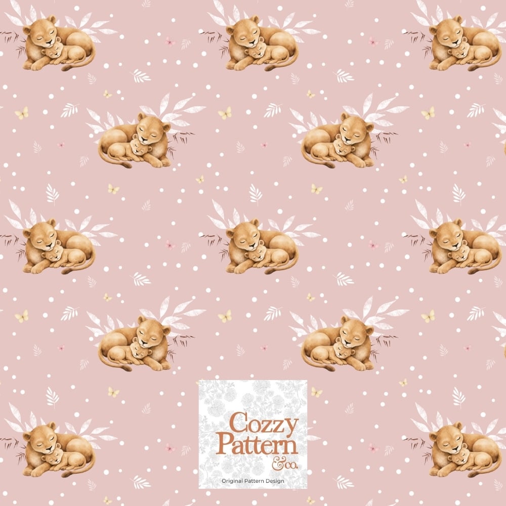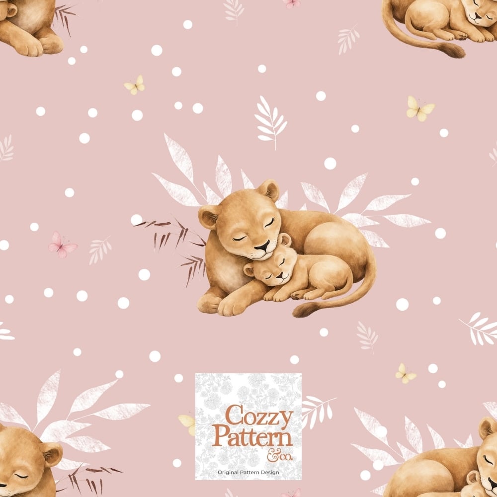 Create adorable baby and nursery projects with this sleeping lion cub seamless pattern, a soft safari-inspired design featuring a mother lion cuddling her baby surrounded by delicate leaves, butterflies and subtle botanical elements.