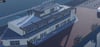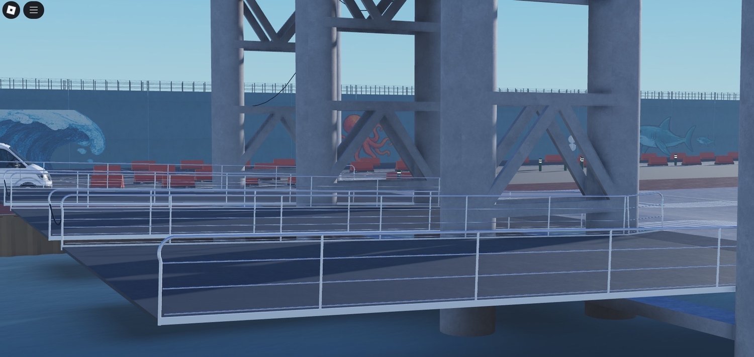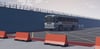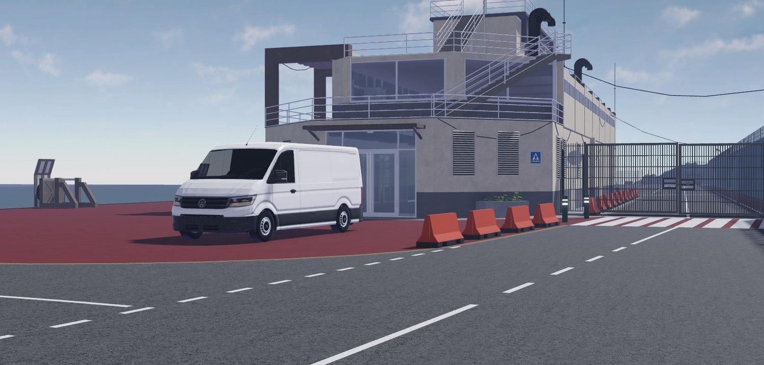 Detailed harbor structures including offices, barriers, and checkpoints,