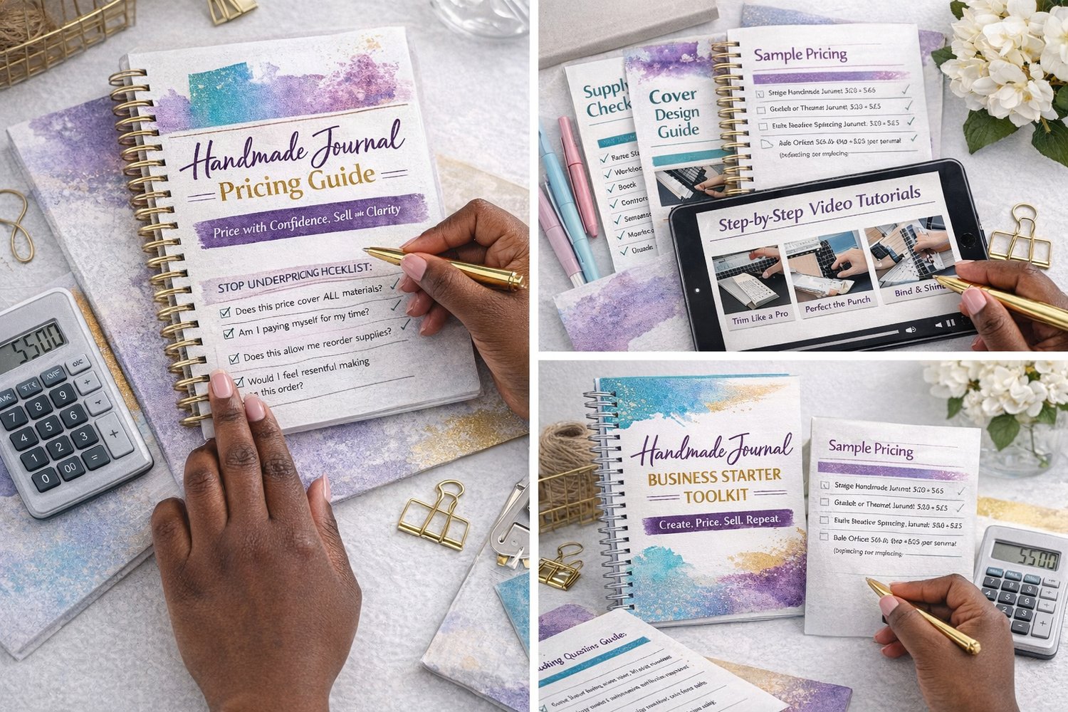 The Handmade Journal Business Starter Toolkit is a beginner-friendly, step-by-step digital bundle that shows you how to create professional-looking journals and confidently step into selling them—without guessing, overcomplicating, or underpricing yourself.