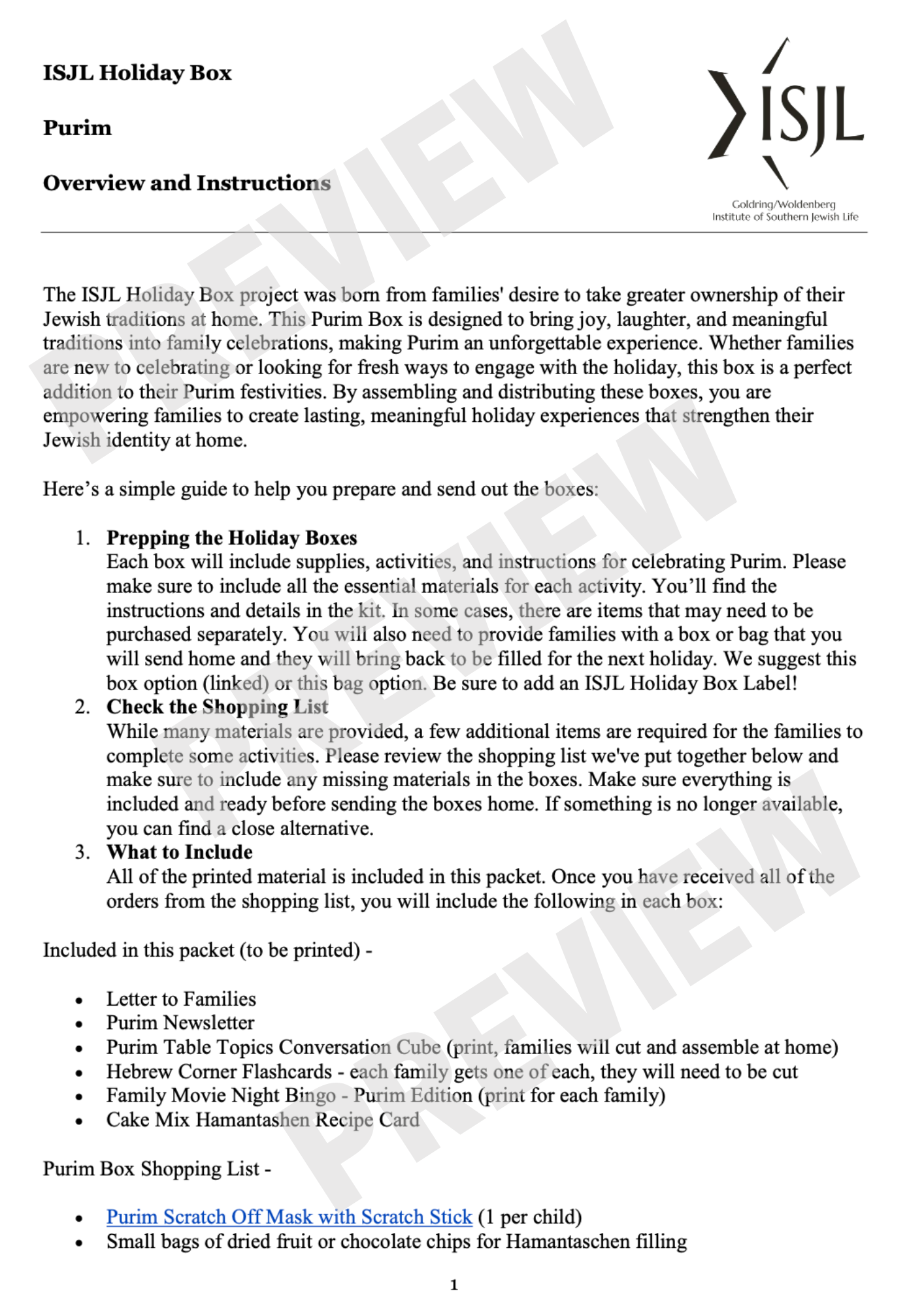 This is our full kit for the ISJL Holidays at Home - Purim. It includes all of the printed material, including the Purim family newsletters, shopping lists for the boxes, a family Purim Movie Bingo and more! Use this kit to help engage families with Judaism at home and connect with one another. The ISJL will be releasing holiday boxes throughout the year and the guides are completely FREE! Enjoy!