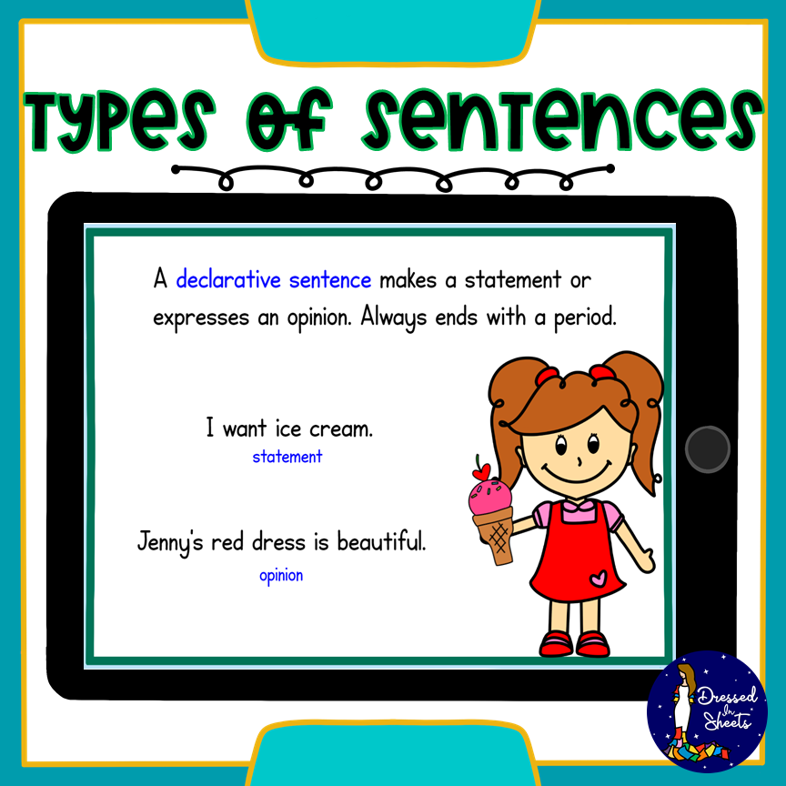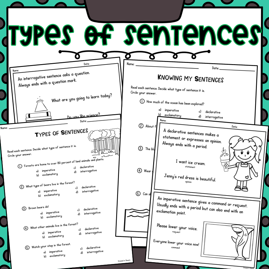 We use different types of sentences to transmit our message across to the reader and make our stories more interesting. There are 3 punctuation marks we use to write. Do you know what they are? This resource can be used as an intro or review about different types of sentences. Students will be quizzed on different types of sentences and then they will see real life pictures and use their acquired skills to write four different types of sentences. Includes declarative sentences, imperative sentences, interrogative sentences, and exclamatory sentences.