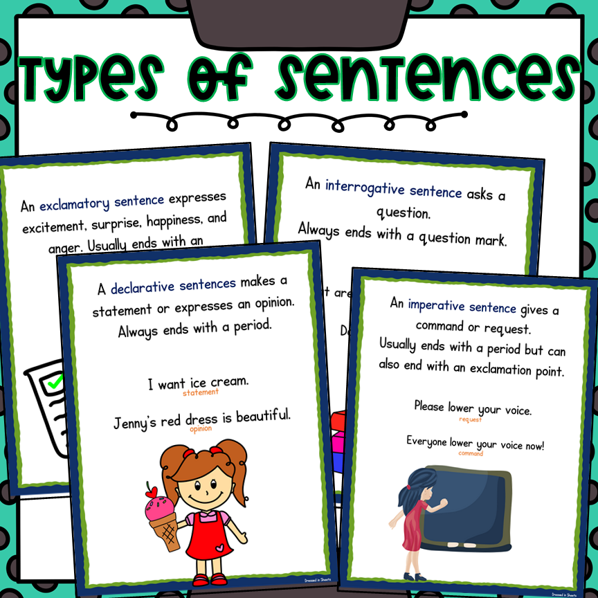 4 color posters about exclamatory, declarative, imperative, and interrogative