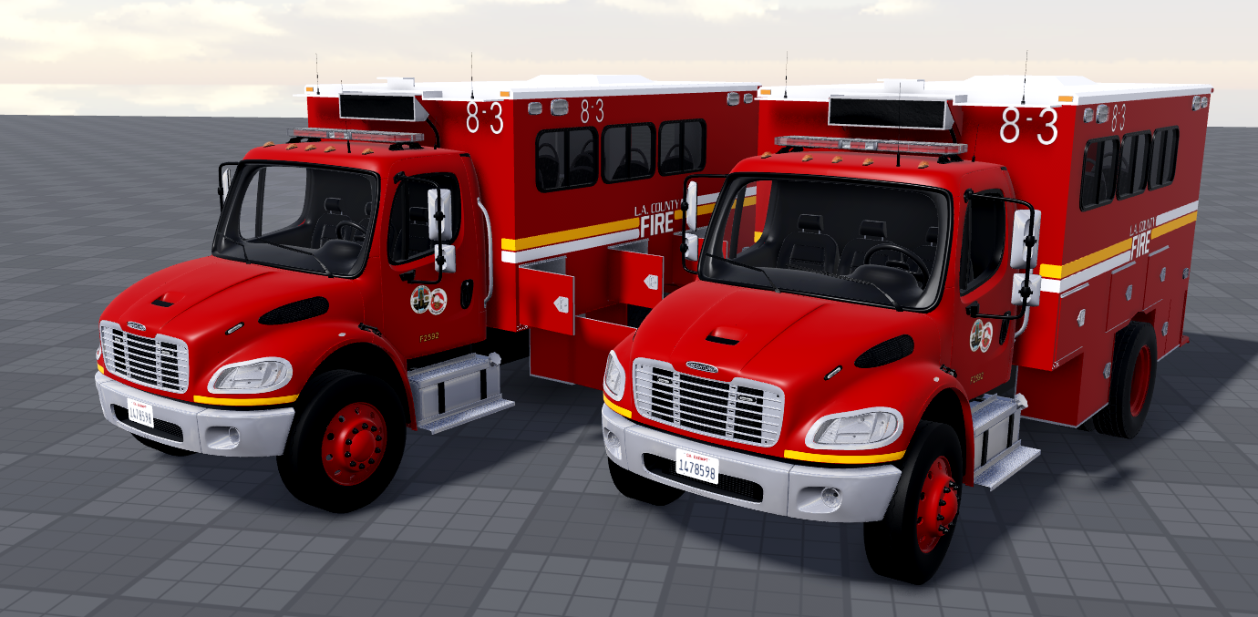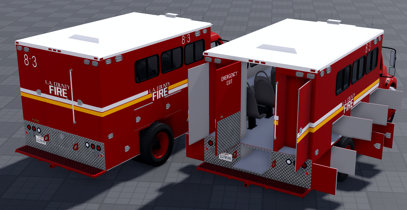 Based off of the LACoFD Crew Carrier 8-3. The livery and ELS is 99% accurate to real life. This includes 3 stages of ELS and 3 stages of directionals. The vehicle also comes with A-chassis so it isn't static. The vehicle doesn't come with any sirens so you will have to add your own. Each vehicle comes with two variants, one has opening compartments while the other doesn't.