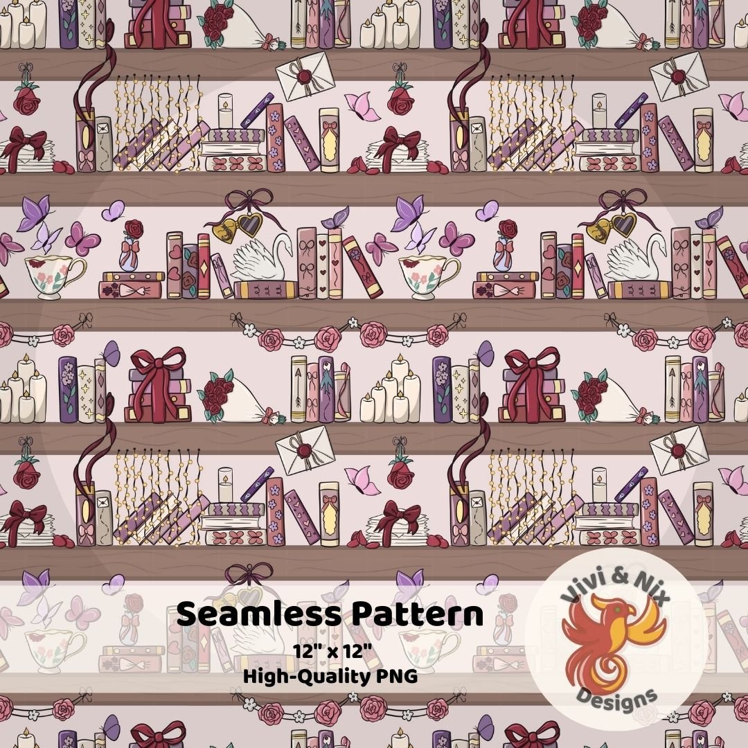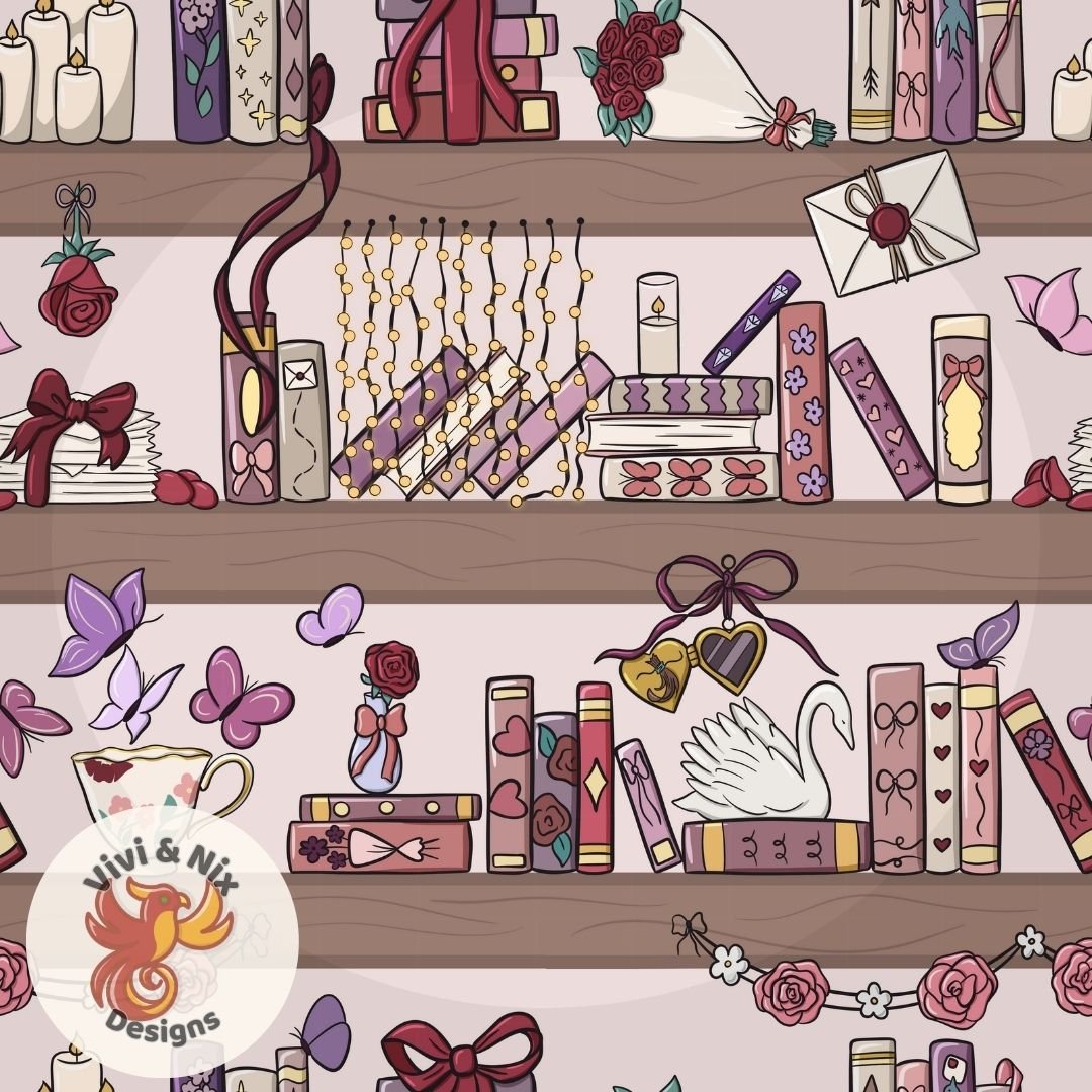 This seamless pattern features layered bookshelves filled with bows, candles, roses, butterflies, teacups, letters, hearts, and dreamy romantic details in soft pinks, purples, and warm neutrals.