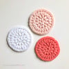 The face scrubby includes a special puff stitch worked in the round, and can be crocheted in 15-20 minutes! It can be a great stash buster if you have some extra cotton yarn lying around. The bath pouf (โloofahโ) is very quick to work up as well, taking only about 45 minutes, and uses less than one full skein of the Lily Sugar nโ Cream yarn in this pattern. The mesh soap saver pouch (or, soap holder bag) has a nifty little drawstring that fits a standard bar of soap, and takes only 30 minutes to crochet. Lastly, the facial washcloth can be whipped up in an hourโs time, and features the beautiful โ but oh, so easy โ Suzette stitch!