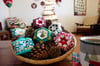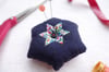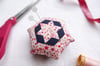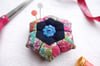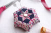 The digital PDF pattern includes 3 different English paper piecing (EPP) designs in varying degrees of complexity. Each EPP design has the option of being finished in 3 different ways, yielding 9 different pin cushions from this single pattern.